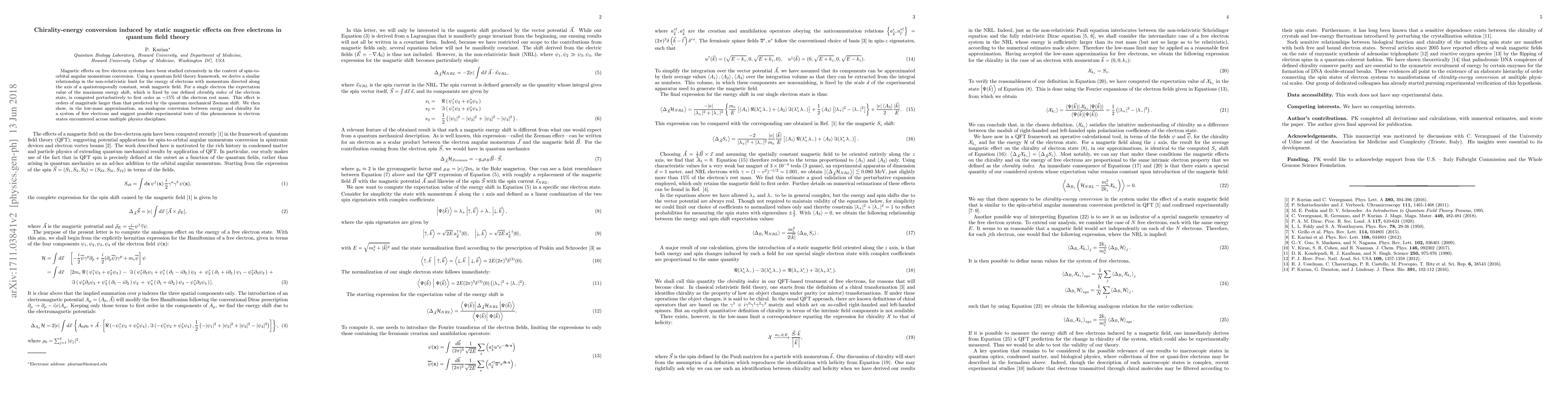 This paper explores the energy conversion induced by static magnetic fields on free electrons in quantum field theory, deriving a significant energy shift related to electron chirality in the non-relativistic limit. The computed energy shift is about 15% of the electron rest mass, much larger than the quantum mechanical Zeeman effect, and suggests potential experimental verification across various physics domains.