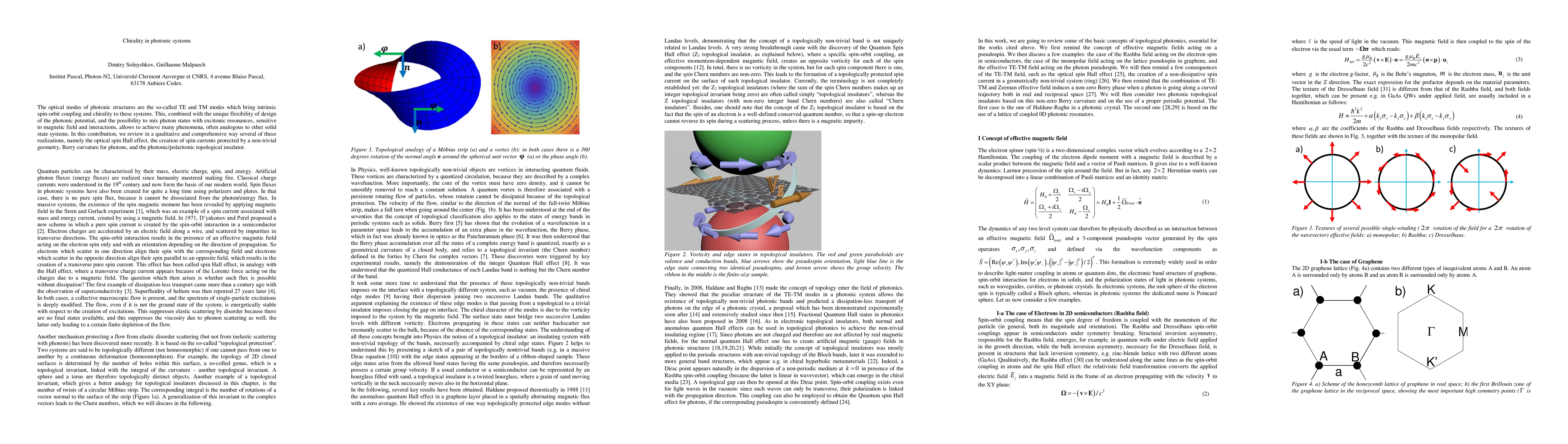 The optical modes of photonic structures are the so-called TE and TM modes which bring intrinsic spin-orbit coupling and chirality to these systems. This, combined with the unique flexibility of design of the photonic potential, and the possibility to mix photon states with excitonic resonances, sensitive to magnetic field and interactions, allows to achieve many phenomena, often analogous to other solid state systems. In this contribution, we review in a qualitative and comprehensive way several of these realizations, namely the optical spin Hall effect, the creation of spin currents protected by a non-trivial geometry, Berry curvature for photons, and the photonic/polaritonic topological insulator.