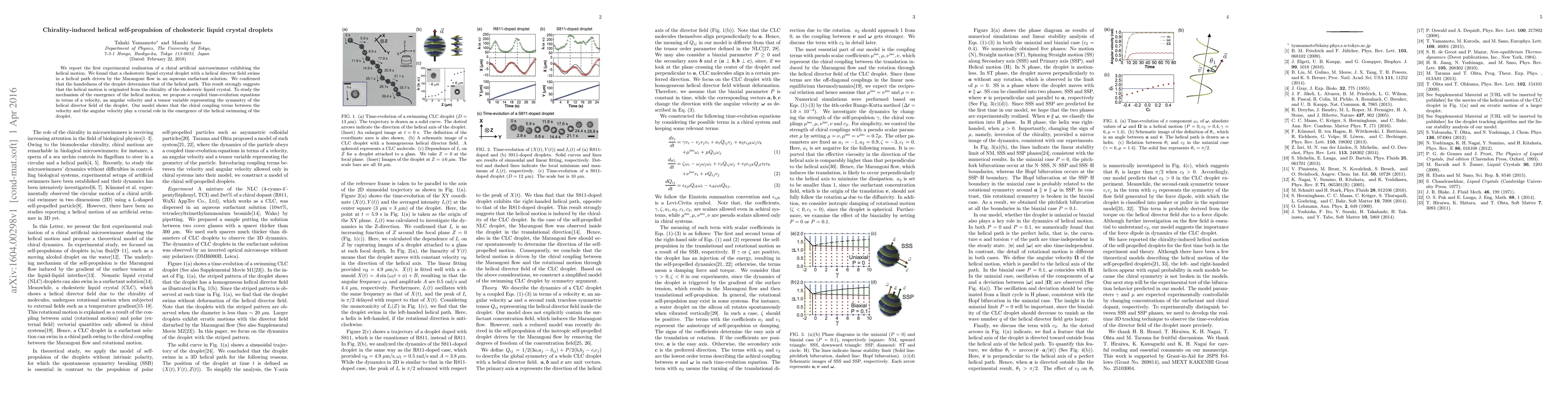 This paper presents the first experimental demonstration of chiral artificial microswimmers that exhibit helical motion driven by Marangoni flow in surfactant solutions. The study reveals that the handedness of cholesteric liquid crystal droplets determines the direction of their helical path, suggesting the chirality of the liquid crystal is the origin of the motion.