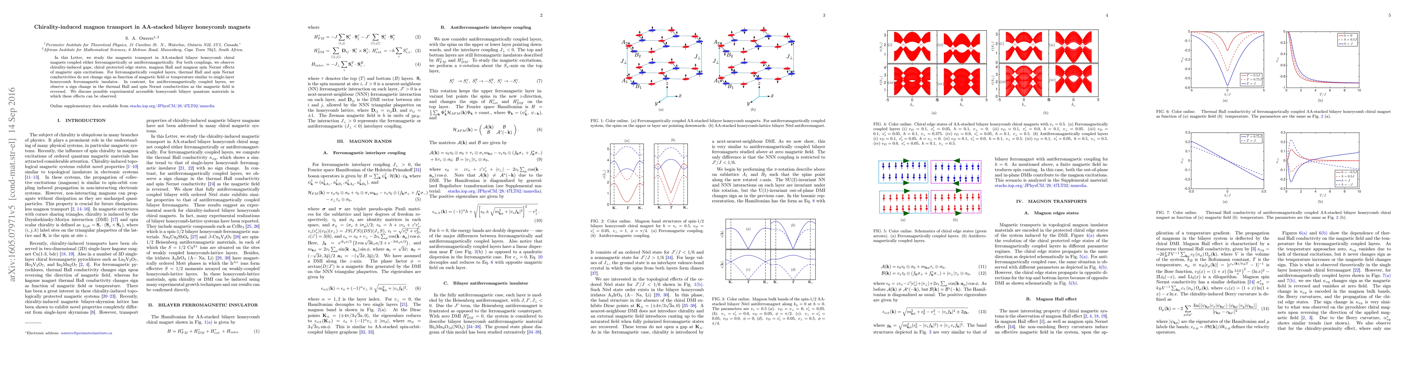 This paper explores magnetic transport in AA-stacked bilayer honeycomb chiral magnets, revealing chirality-induced gaps, edge states, and unique thermal Hall and spin Nernst effects depending on ferromagnetic or antiferromagnetic coupling. Antiferromagnetic coupling shows a sign change in thermal Hall and spin Nernst conductivities with magnetic field reversal.