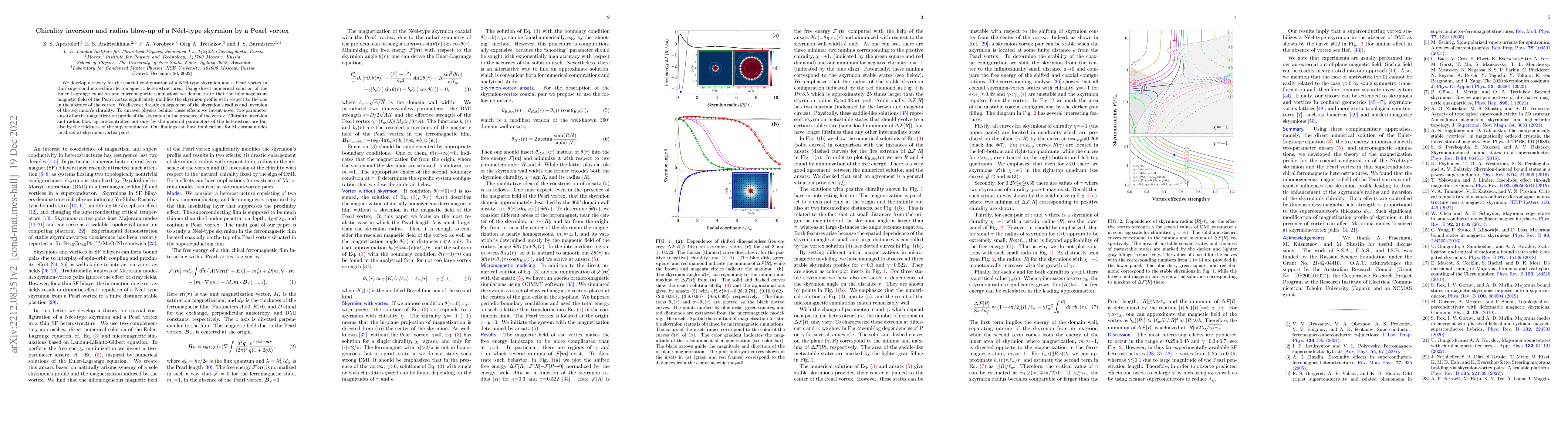 We develop a theory for the coaxial configuration of a N\'eel-type skyrmion and a Pearl vortex in thin superconductor-chiral ferromagnetic heterostructures. Using direct numerical solution of the Euler-Lagrange equation and micromagnetic simulations we demonstrate that the inhomogeneous magnetic field of the Pearl vortex significantly modifies the skyrmion profile with respect to the one in the absence of the vortex. We discover drastic enlargement of the skyrmion's radius and inversion of the skyrmion's chirality. To unravel physics behind these effects we invent novel two-parameter ansatz for the magnetization profile of the skyrmion in the presence of the vortex. Chirality inversion and radius blow-up are controlled not only by the material parameters of the heterostructure but also by the thickness of the superconductor. Our findings can have implications for Majorana modes localized at skyrmion-vortex pairs.