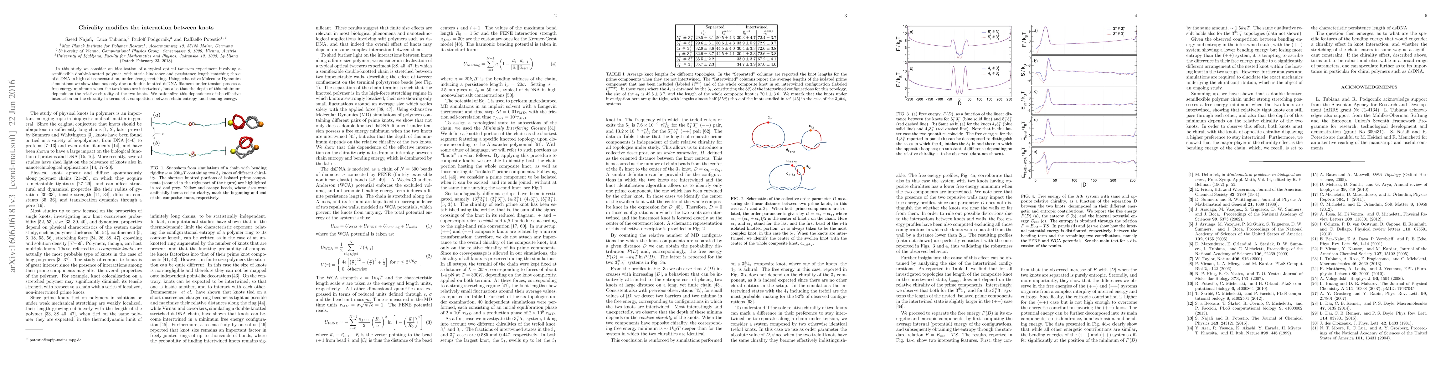In this study we consider an idealization of a typical optical tweezers experiment involving a semiflexible double-knotted polymer, with steric hindrance and persistence length matching those of dsDNA in high salt concentration, under strong stretching. Using exhaustive Molecular Dynamics simulations we show that not only does a double-knotted dsDNA filament under tension possess a free energy minimum when the two knots are intertwined, but also that the depth of this minimum depends on the relative chirality of the two knots. We rationalize this dependence of the effective interaction on the chirality in terms of a competition between chain entropy and bending energy.