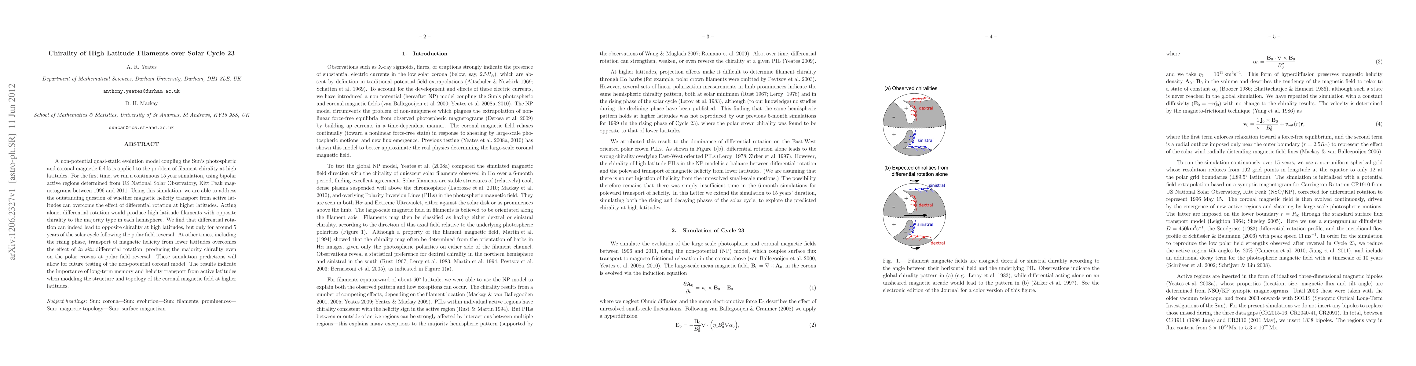 A non-potential quasi-static evolution model coupling the Sun's photospheric and coronal magnetic fields is applied to the problem of filament chirality at high latitudes. For the first time, we run a continuous 15 year simulation, using bipolar active regions determined from US National Solar Observatory, Kitt Peak magnetograms between 1996 and 2011. Using this simulation, we are able to address the outstanding question of whether magnetic helicity transport from active latitudes can overcome the effect of differential rotation at higher latitudes. Acting alone, differential rotation would produce high latitude filaments with opposite chirality to the majority type in each hemisphere. We find that differential rotation can indeed lead to opposite chirality at high latitudes, but only for around 5 years of the solar cycle following the polar field reversal. At other times, including the rising phase, transport of magnetic helicity from lower latitudes overcomes the effect of in situ differential rotation, producing the majority chirality even on the polar crowns at polar field reversal. These simulation predictions will allow for future testing of the non-potential coronal model. The results indicate the importance of long-term memory and helicity transport from active latitudes when modeling the structure and topology of the coronal magnetic field at higher latitudes.
