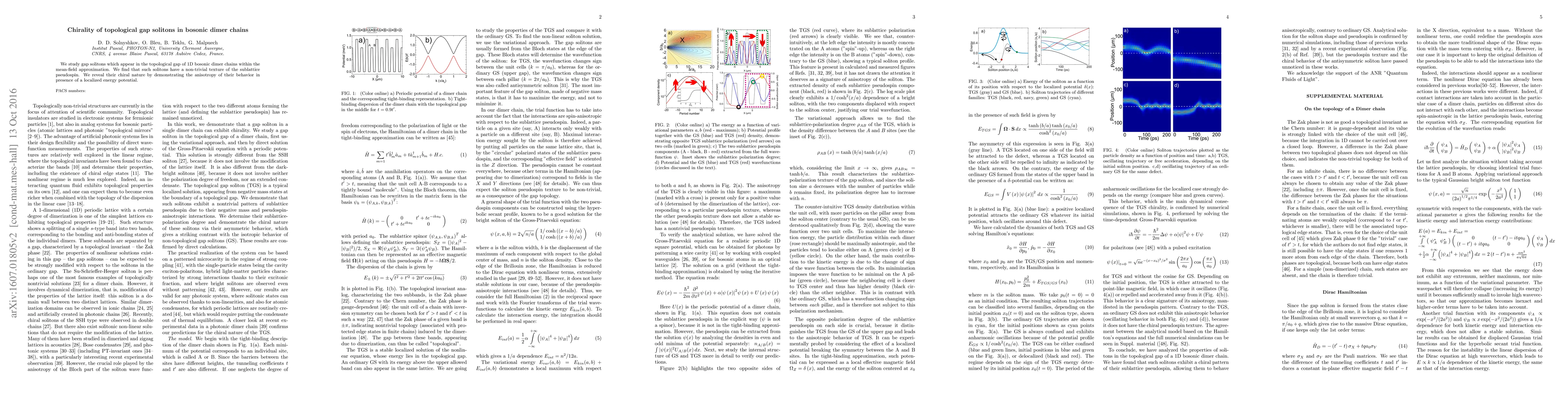This research investigates gap solitons in 1D bosonic dimer chains, revealing their chirality through the sublattice pseudospin texture. The study shows anisotropic behavior of these solitons in the presence of localized energy potentials.