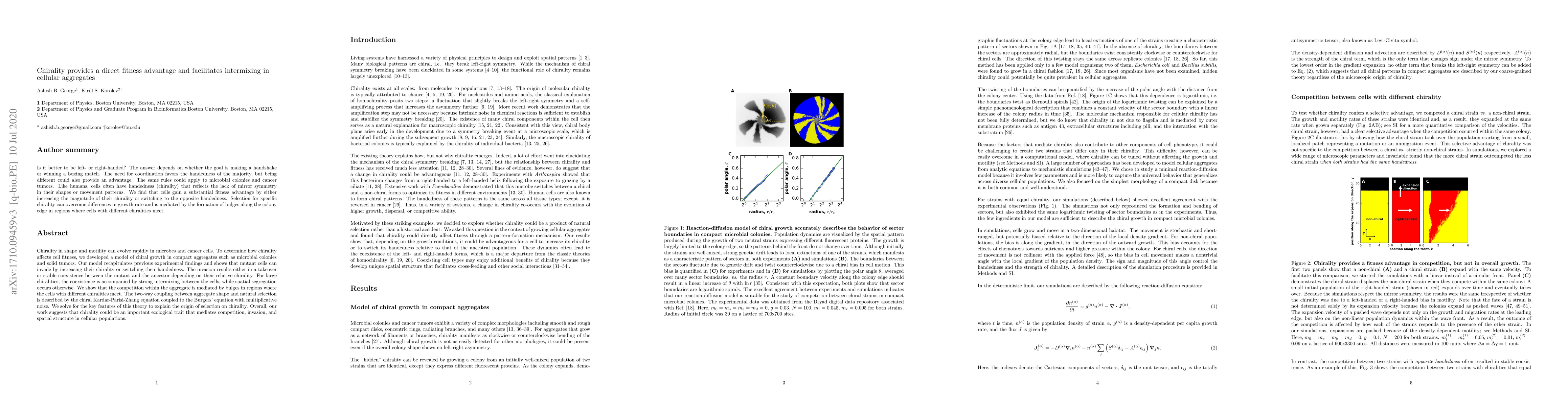 Chirality in shape and motility can evolve rapidly in microbes and cancer cells. To determine how chirality affects cell fitness, we developed a model of chiral growth in compact aggregates such as microbial colonies and solid tumors. Our model recapitulates previous experimental findings and shows that mutant cells can invade by increasing their chirality or switching their handedness. The invasion results either in a takeover or stable coexistence between the mutant and the ancestor depending on their relative chirality. For large chiralities, the coexistence is accompanied by strong intermixing between the cells, while spatial segregation occurs otherwise. We show that the competition within the aggregate is mediated by bulges in regions where the cells with different chiralities meet. The two-way coupling between aggregate shape and natural selection is described by the chiral Kardar-Parisi-Zhang equation coupled to the Burgers' equation with multiplicative noise. We solve for the key features of this theory to explain the origin of selection on chirality. Overall, our work suggests that chirality could be an important ecological trait that mediates competition, invasion, and spatial structure in cellular populations.