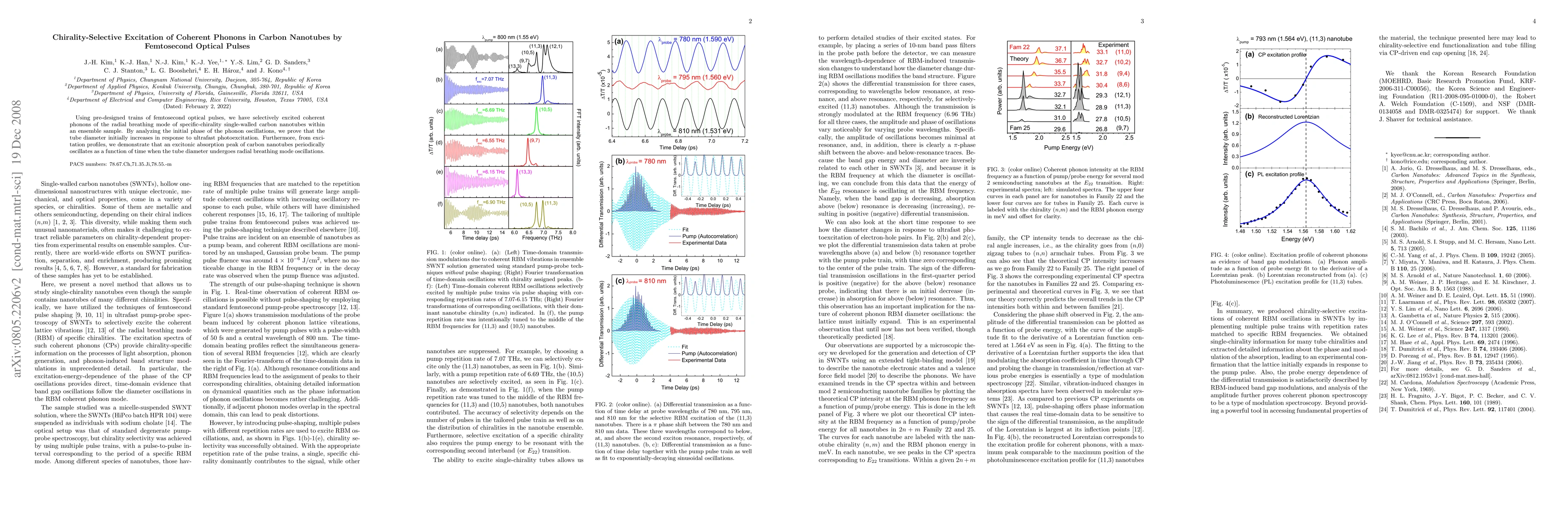 This study selectively excites coherent phonons of specific-chirality single-walled carbon nanotubes using femtosecond optical pulses, showing an initial increase in tube diameter post-excitation. It reveals that excitonic absorption peaks oscillate temporally in sync with radial breathing mode oscillations.