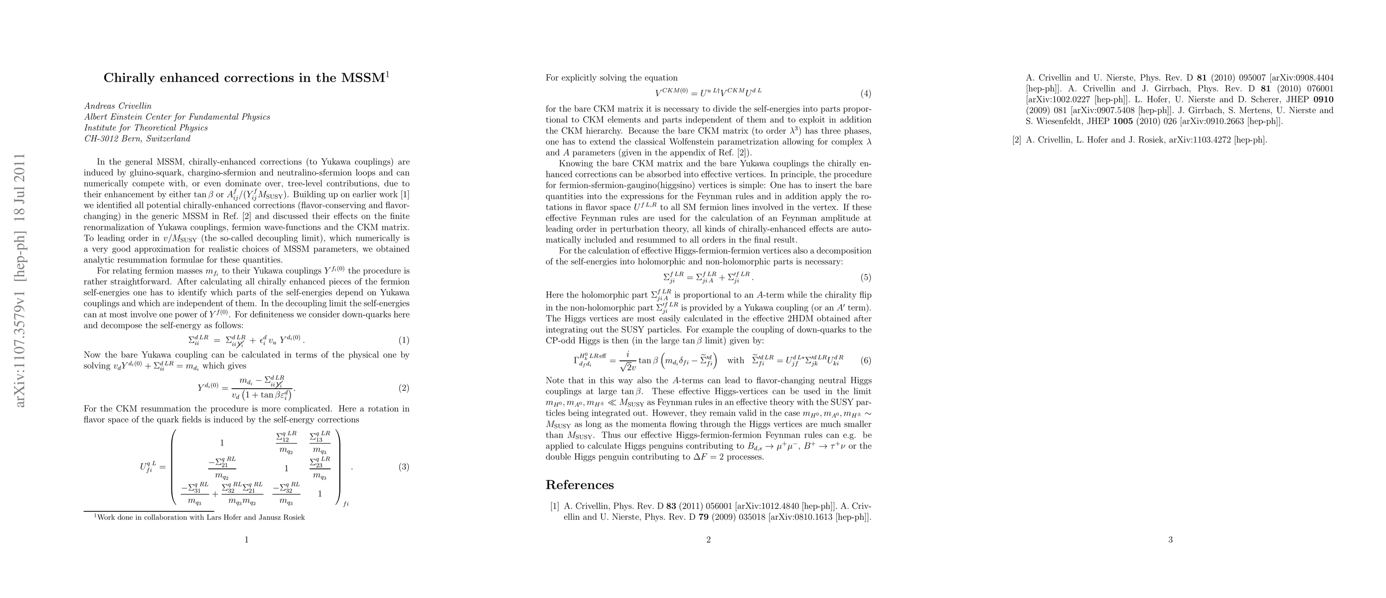 This paper reviews the resummation of chirally-enhanced corrections in the MSSM, focusing on contributions from gluino-squark, chargino-sfermion, and neutralino-sfermion loops that can dominate over tree-level contributions due to chiral enhancement. The work is based on recent collaborative efforts with Lars Hofer and Janusz Rosiek.
