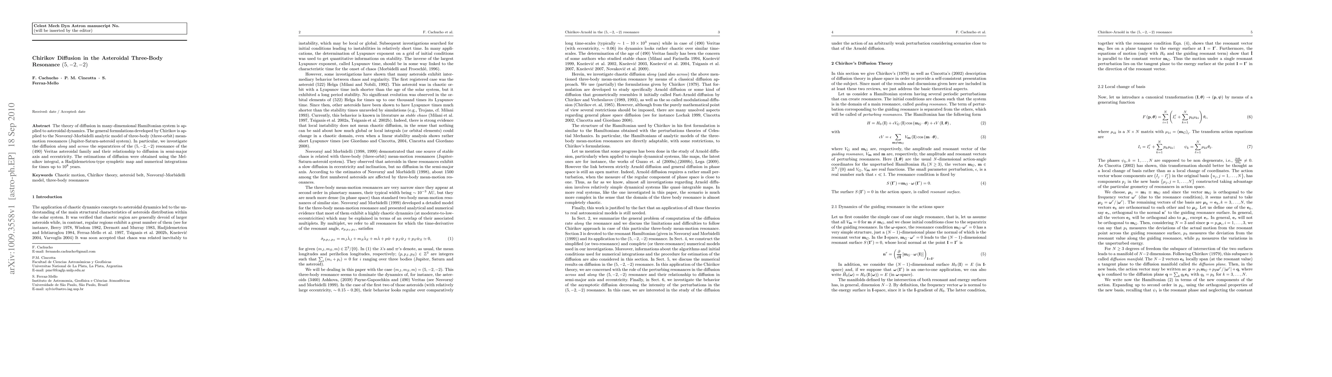 This paper applies Chirikov's diffusion theory to the Nesvorný-Morbidelli model of the (5,-2,-2) three-body resonance in the Jupiter-Saturn-asteroid system, focusing on diffusion along and across the resonance's separatrices. Diffusion estimates were derived using the Melnikov integral, a symplectic map, and numerical integrations over $10^{8}$ years.