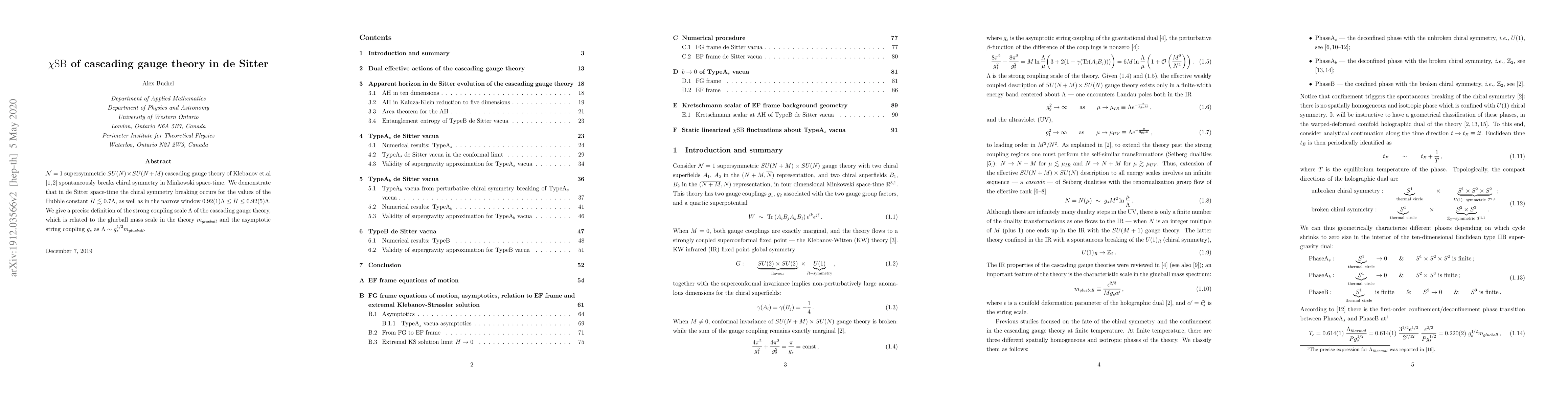 ${\cal N}=1$ supersymmetric $SU(N)\times SU(N+M)$ cascading gauge theory of Klebanov et.al spontaneously breaks chiral symmetry in Minkowski space-time. We demonstrate that in de Sitter space-time the chiral symmetry breaking occurs for the values of the Hubble constant $H\lesssim 0.7 \Lambda $, as well as in a narrow window $0.92(1) \Lambda \le H\le 0.92(5) \Lambda $. We give a precise definition of the strong coupling scale $\Lambda $ of cascading gauge theory, which is related to the glueball mass scale in the theory $m_{glueball}$ and the asymptotic string coupling $g_s$ as $\Lambda \sim g_s^{1/2} m_{glueball}$.