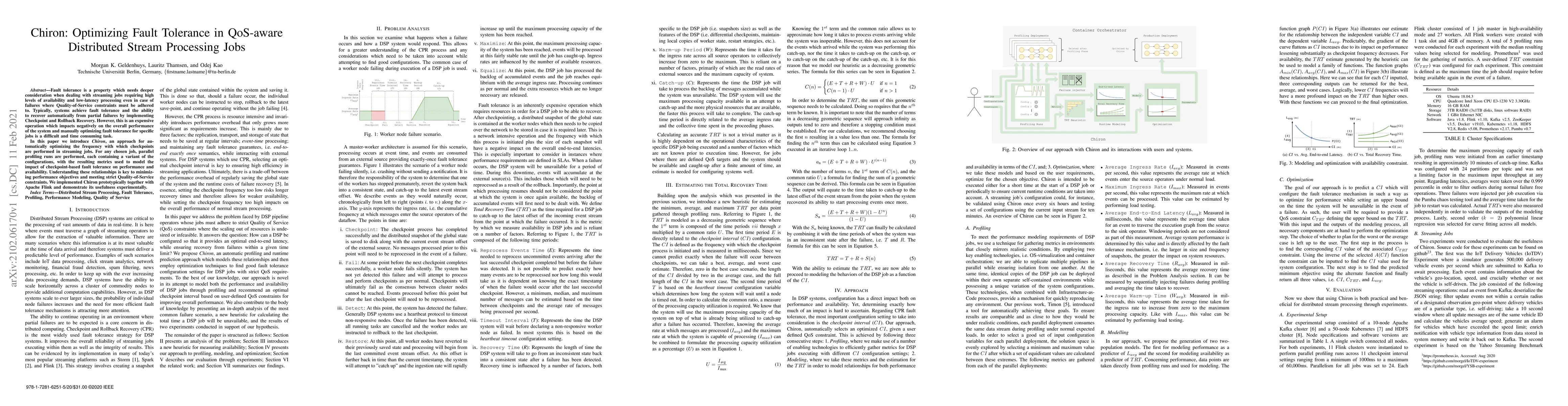 Fault tolerance is a property which needs deeper consideration when dealing with streaming jobs requiring high levels of availability and low-latency processing even in case of failures where Quality-of-Service constraints must be adhered to. Typically, systems achieve fault tolerance and the ability to recover automatically from partial failures by implementing Checkpoint and Rollback Recovery. However, this is an expensive operation which impacts negatively on the overall performance of the system and manually optimizing fault tolerance for specific jobs is a difficult and time consuming task. In this paper we introduce Chiron, an approach for automatically optimizing the frequency with which checkpoints are performed in streaming jobs. For any chosen job, parallel profiling runs are performed, each containing a variant of the configurations, with the resulting metrics used to model the impact of checkpoint-based fault tolerance on performance and availability. Understanding these relationships is key to minimizing performance objectives and meeting strict Quality-of-Service constraints. We implemented Chiron prototypically together with Apache Flink and demonstrate its usefulness experimentally.