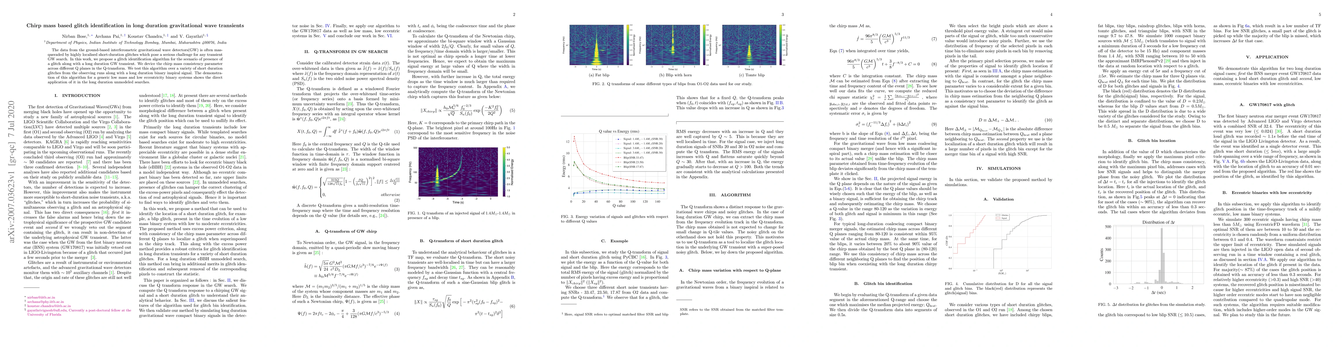 This paper proposes a glitch identification algorithm using chirp mass consistency across different Q planes in the Q-transform to detect and differentiate between short-duration glitches and long-duration gravitational wave transients in detector data. The algorithm is tested on various glitches and a binary inspiral signal, demonstrating its effectiveness for low mass and low eccentricity binary systems in unmodeled searches.