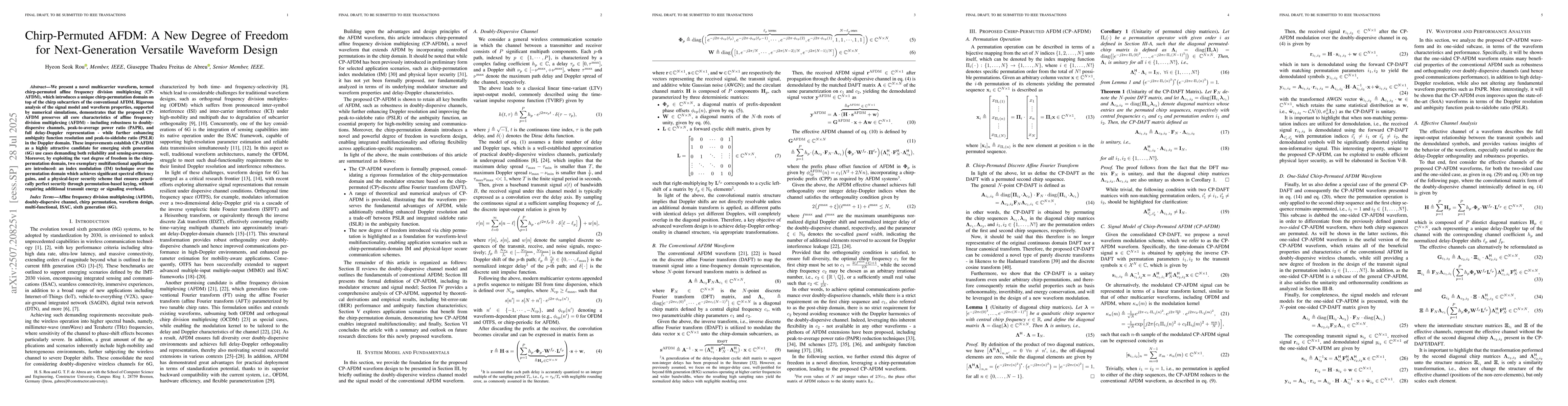 The research presents a novel multicarrier waveform, Chirp-Permuted Affine Frequency Division Multiplexing (CP-AFDM), which extends AFDM by introducing a flexible chirp-permutation domain. The properties and performance of CP-AFDM are rigorously analyzed, confirming it preserves key AFDM characteristics while enhancing Doppler resolution and PSLR.
