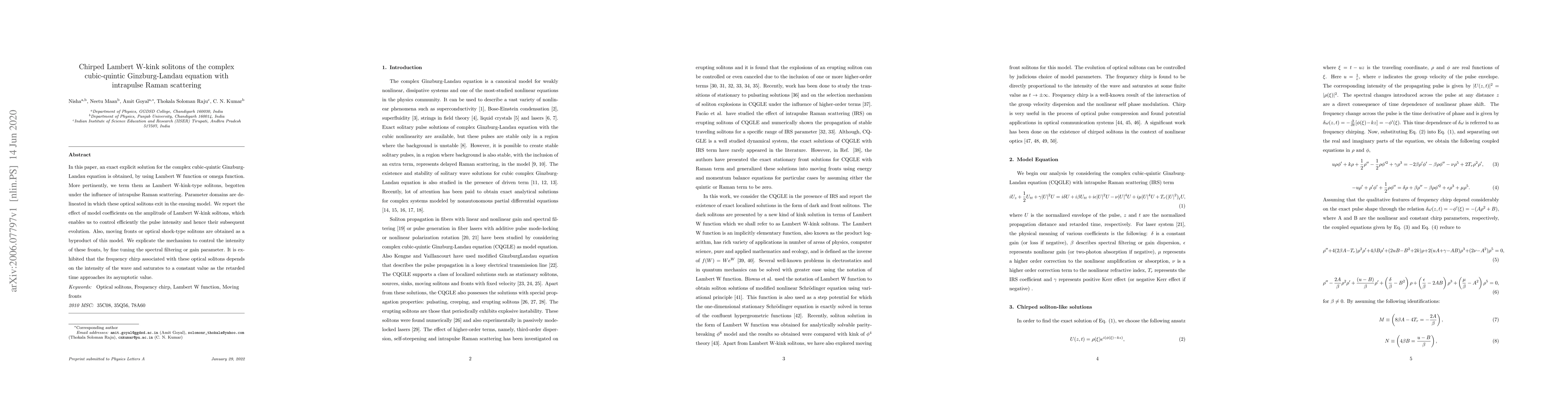 In this paper, an exact explicit solution for the complex cubic-quintic Ginzburg-Landau equation is obtained, by using Lambert W function or omega function. More pertinently, we term them as Lambert W-kink-type solitons, begotten under the influence of intrapulse Raman scattering. Parameter domains are delineated in which these optical solitons exit in the ensuing model. We report the effect of model coefficients on the amplitude of Lambert W-kink solitons, which enables us to control efficiently the pulse intensity and hence their subsequent evolution. Also, moving fronts or optical shock-type solitons are obtained as a byproduct of this model. We explicate the mechanism to control the intensity of these fronts, by fine tuning the spectral filtering or gain parameter. It is exhibited that the frequency chirp associated with these optical solitons depends on the intensity of the wave and saturates to a constant value as the retarded time approaches its asymptotic value.