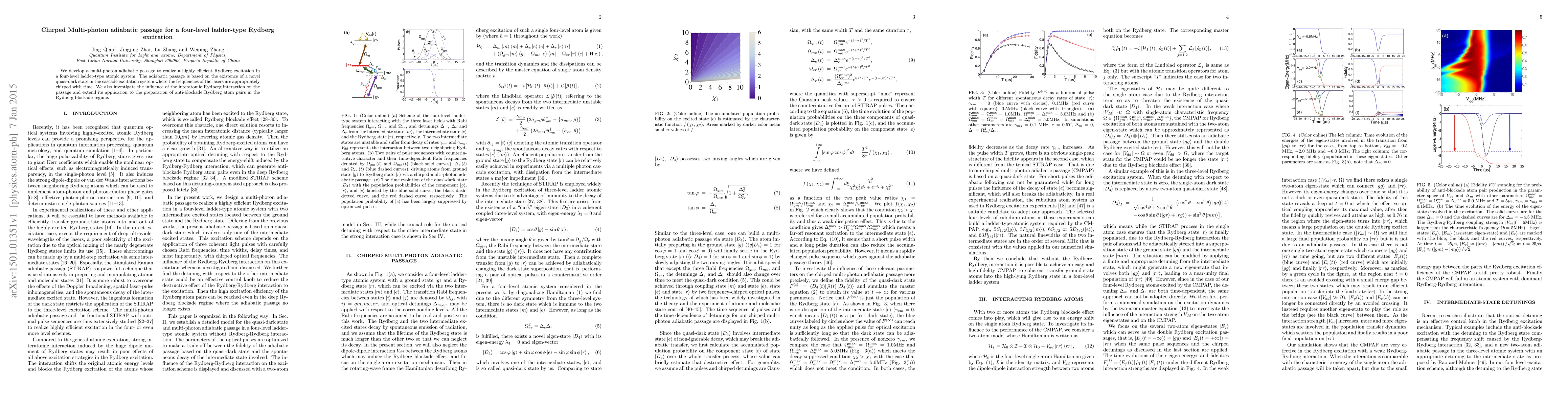 Summary: This paper proposes a multi-photon adiabatic passage method for efficient Rydberg excitation in a four-level atomic system using chirped laser frequencies and a quasi-dark state. It also examines the impact of Rydberg interactions and explores its use in creating anti-blockade Rydberg atom pairs.