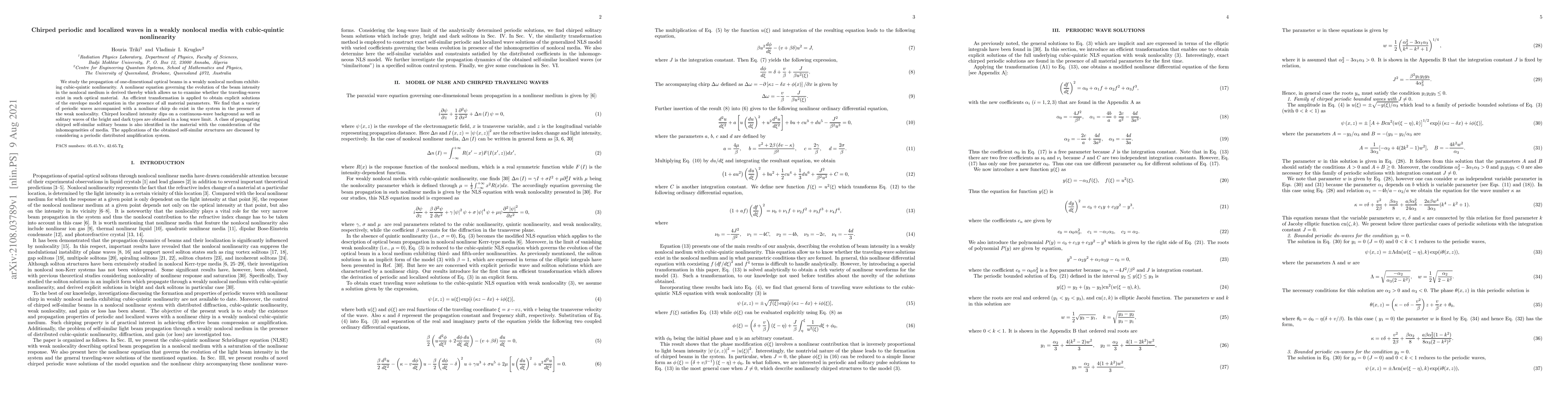 This research derives a nonlinear equation for optical beam propagation in weakly nonlocal media with cubic-quintic nonlinearity, revealing periodic and localized chirped waves, including solitons and intensity dips, and identifies chirped self-similar solitary beams applicable in periodic amplification systems.