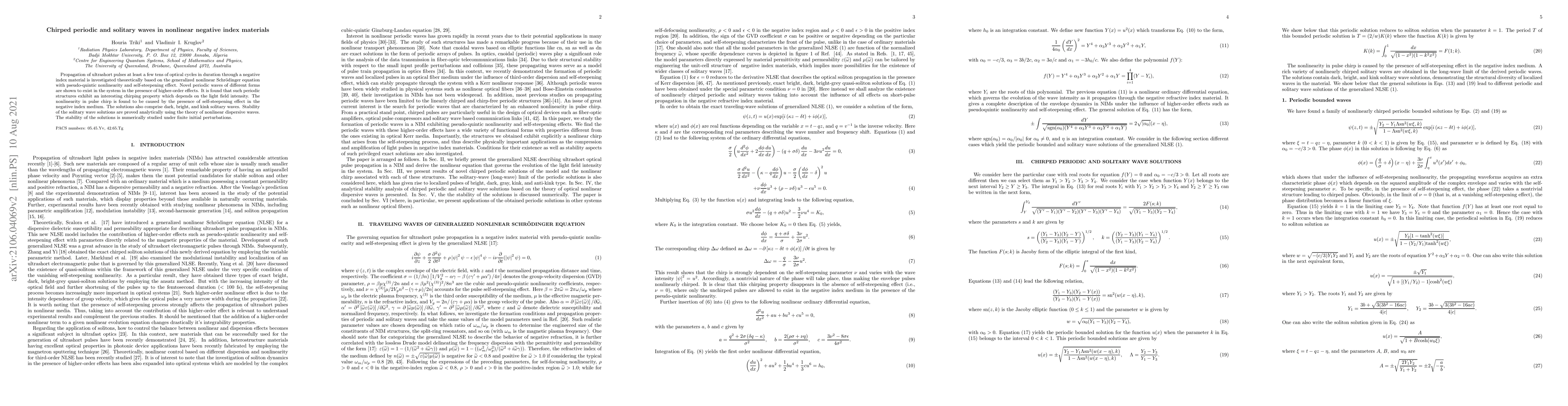 This paper investigates the propagation of ultrashort pulses in negative index materials using a generalized nonlinear Schrödinger equation, revealing novel periodic and solitary wave solutions, including chirped periodic waves and dark, bright, and kink solitons. Analytical and numerical stability analyses confirm the robustness of these solutions under perturbations.