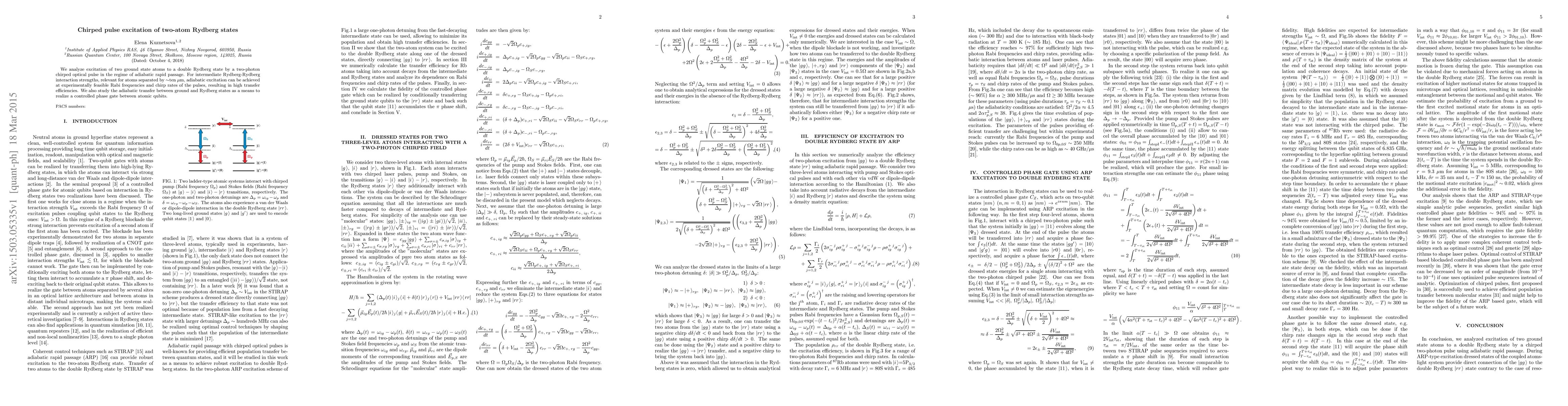 This research explores the excitation of two ground state atoms to a double Rydberg state using a chirped optical pulse, achieving adiabatic rapid passage with high efficiency. It also investigates the use of adiabatic transfer for implementing a controlled phase gate between atomic qubits.