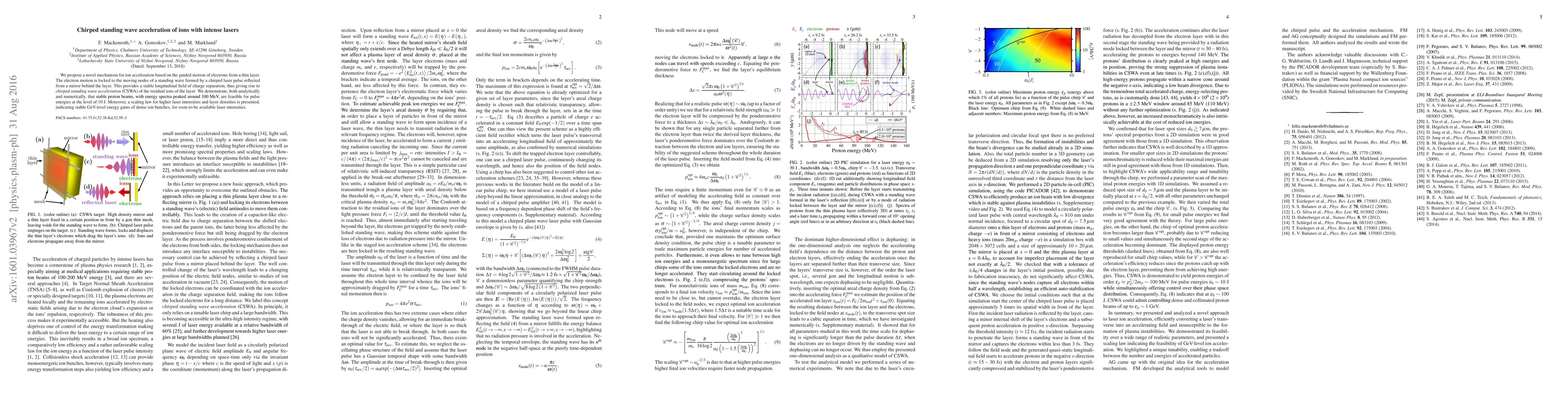 This paper introduces chirped standing wave acceleration (CSWA) for ion acceleration using intense lasers, where electrons from a thin target are guided by a standing wave formed by a chirped laser pulse. The method can produce quasi-monoenergetic ion beams with energies up to 100 MeV, potentially scaling to GeV levels with higher laser intensities.