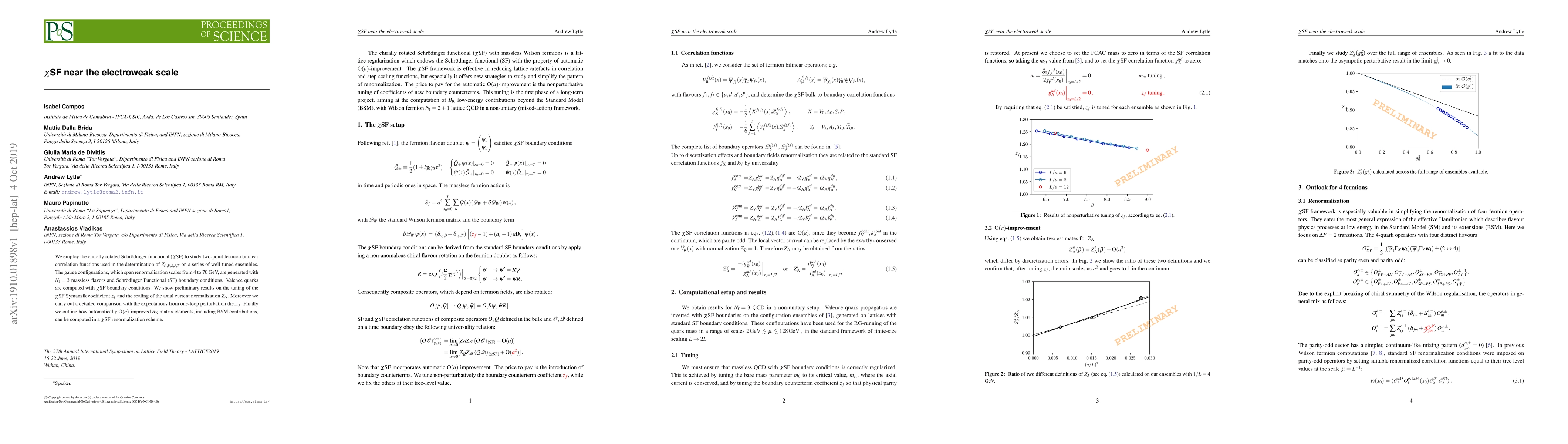 We employ the chirally rotated Schr\"odinger functional ($\chi$SF) to study two-point fermion bilinear correlation functions used in the determination of $Z_{A,V,S,P,T}$ on a series of well-tuned ensembles. The gauge configurations, which span renormalisation scales from 4 to 70~GeV, are generated with $N_{\rm f}=3$ massless flavors and Schr\"odinger Functional (SF) boundary conditions. Valence quarks are computed with $\chi$SF boundary conditions. We show preliminary results on the tuning of the $\chi$SF Symanzik coefficient $z_f$ and the scaling of the axial current normalization $Z_{\rm A}$. Moreover we carry out a detailed comparison with the expectations from one-loop perturbation theory. Finally we outline how automatically $\mathrm{O}(a)$-improved $B_{\rm K}$ matrix elements, including BSM contributions, can be computed in a $\chi$SF renormalization scheme.