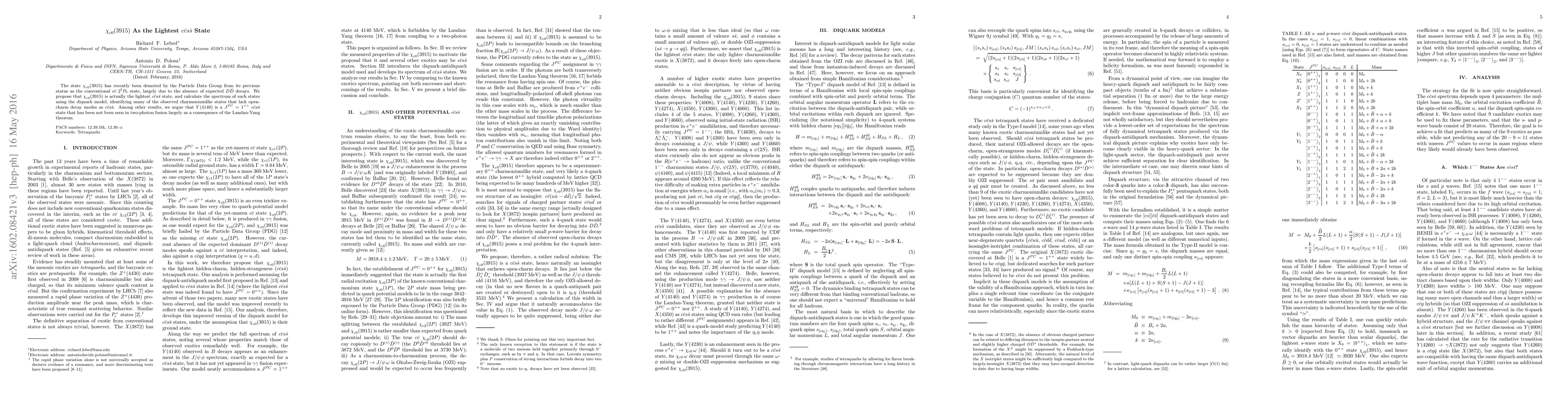 The paper proposes that the state $\chi^{\vphantom\dagger}_{c0}(3915)$ is the lightest $c\bar c s \bar s$ state instead of a conventional $c\bar c$ $2 {}^3P_0$ state, and uses the diquark model to identify other charmoniumlike states as $c\bar c s \bar s$. It also suggests that $Y(4140)$ is a $1^{++}$ $c\bar c s \bar s$ state, explaining its lack of two-photon fusion observation via the Landau-Yang theorem.