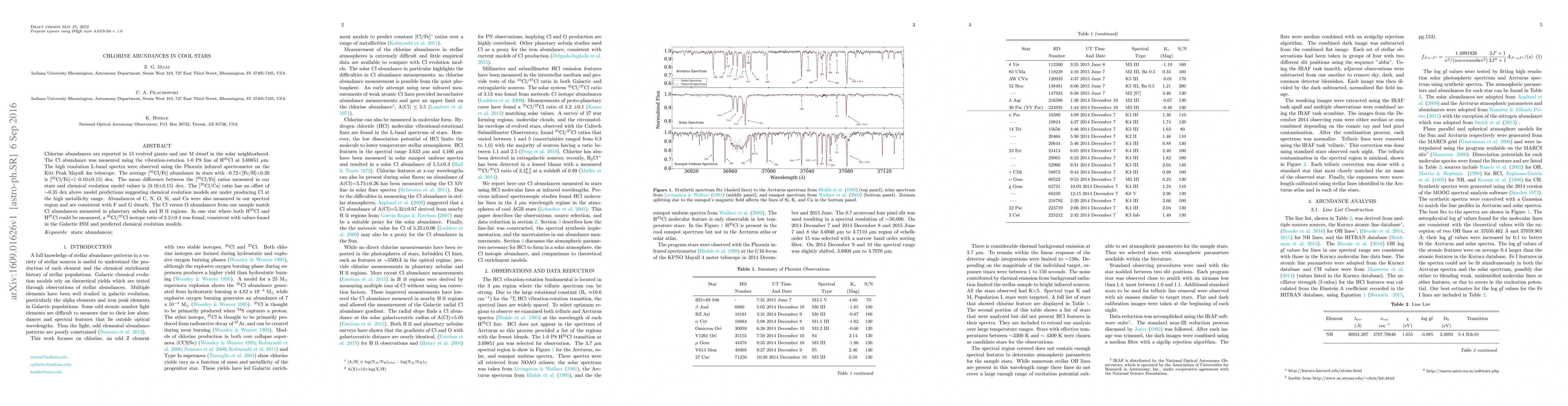 Chlorine abundances are reported in 15 evolved giants and one M dwarf in the solar neighborhood. The Cl abundance was measured using the vibration-rotation 1-0 P8 line of H$^{35}$Cl at 3.69851 $\mu$m. The high resolution L-band spectra were observed using the Phoenix infrared spectrometer on the Kitt Peak Mayall 4m telescope. The average [$^{35}$Cl/Fe] abundance in stars with --0.72$<$[Fe/H]$<$0.20 is [$^{35}$Cl/Fe]=(--0.10$\pm$0.15) dex. The mean difference between the [$^{35}$Cl/Fe] ratios measured in our stars and chemical evolution model values is (0.16$\pm$0.15) dex. The [$^{35}$Cl/Ca] ratio has an offset of $\sim$0.35 dex above model predictions suggesting chemical evolution models are under producing Cl at the high metallicity range. Abundances of C, N, O, Si, and Ca were also measured in our spectral region and are consistent with F and G dwarfs. The Cl versus O abundances from our sample match Cl abundances measured in planetary nebula and \ion{H}{2} regions. In one star where both H$^{35}$Cl and H$^{37}$Cl could be measured, a $^{35}$Cl/$^{37}$Cl isotope ratio of 2.2$\pm$0.4 was found, consistent with values found in the Galactic ISM and predicted chemical evolution models.