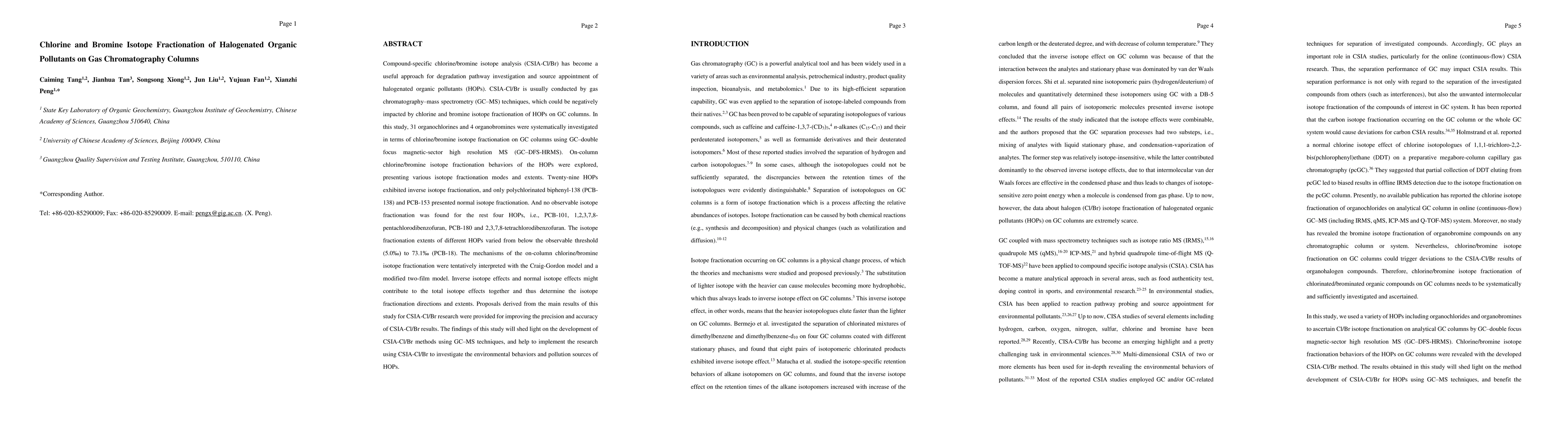 This study investigates chlorine and bromine isotope fractionation on gas chromatography columns for halogenated organic pollutants using GC-DFS-HRMS, revealing varied fractionation behaviors. Most compounds showed inverse fractionation, while some exhibited normal fractionation or no fractionation, highlighting the need for improved precision in CSIA-Cl/Br methods for environmental studies.