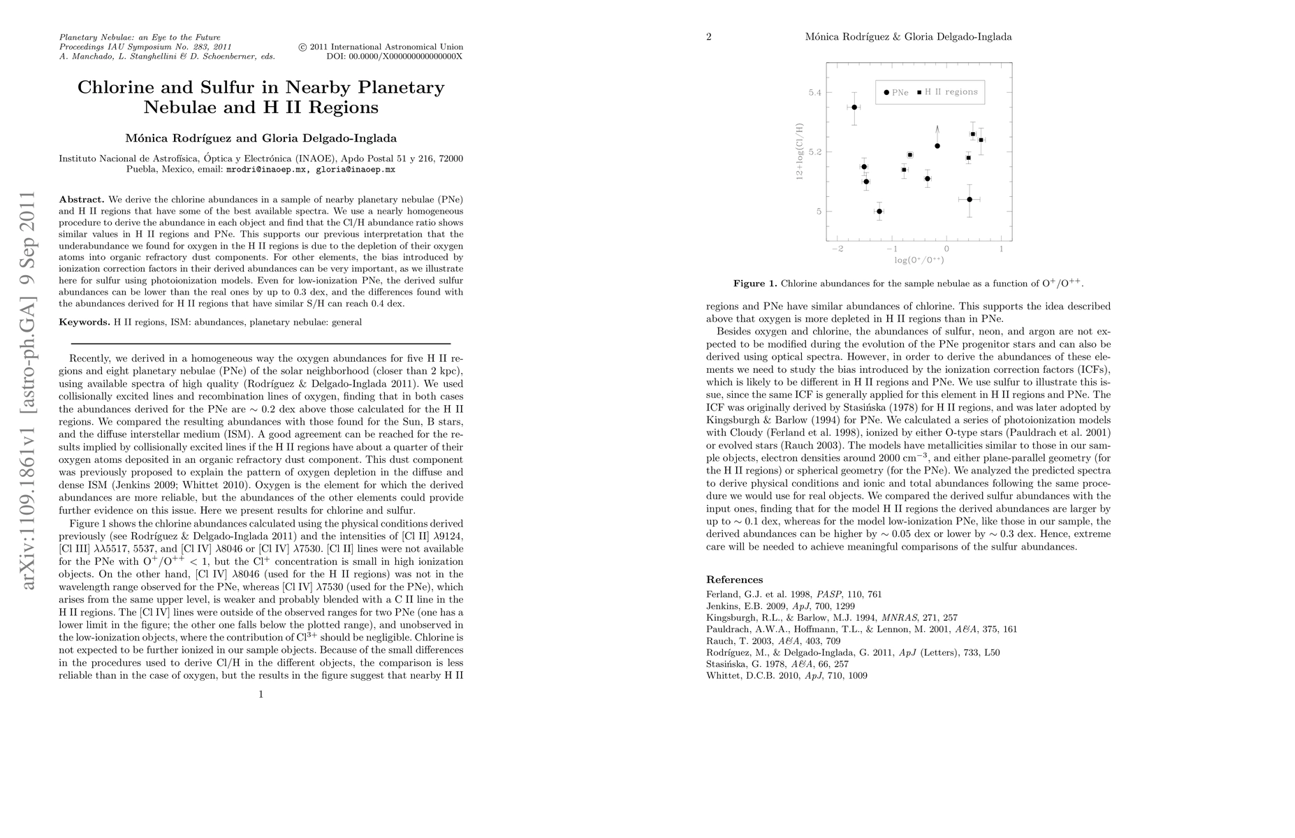 This study derives chlorine abundances in nearby planetary nebulae and H II regions, revealing consistent Cl/H ratios in both types of objects. It supports the hypothesis that oxygen underabundance in H II regions is due to oxygen depletion into organic dust. For sulfur, ionization correction factors significantly affect derived abundances, potentially underestimating true values by up to 0.3 dex in low-ionization planetary nebulae.