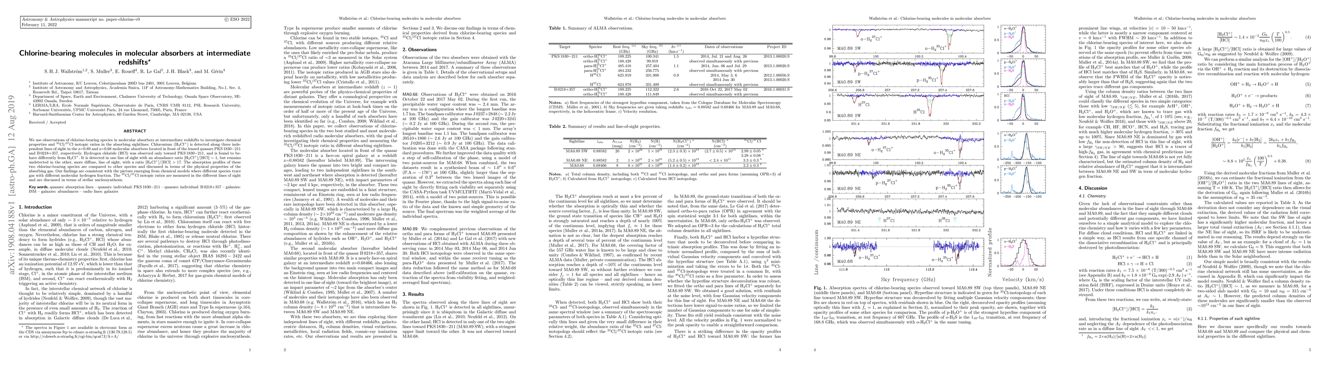 This paper investigates chlorine-bearing molecules (chloronium and hydrogen chloride) in molecular absorbers at intermediate redshifts, finding distinct behaviors and isotopic ratios that suggest different physical conditions and nucleosynthesis processes in the absorbing gas.