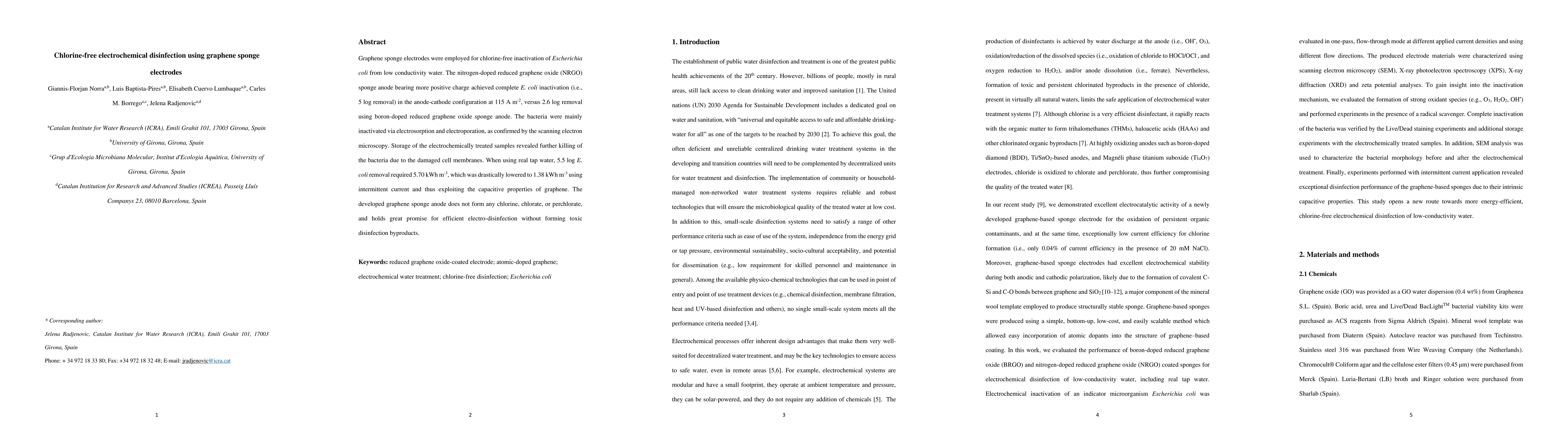 Graphene sponge electrodes, specifically nitrogen-doped reduced graphene oxide, achieve complete E. coli inactivation in water via electrosorption and electroporation, with minimal energy consumption using intermittent current. This chlorine-free method avoids toxic disinfection byproducts.
