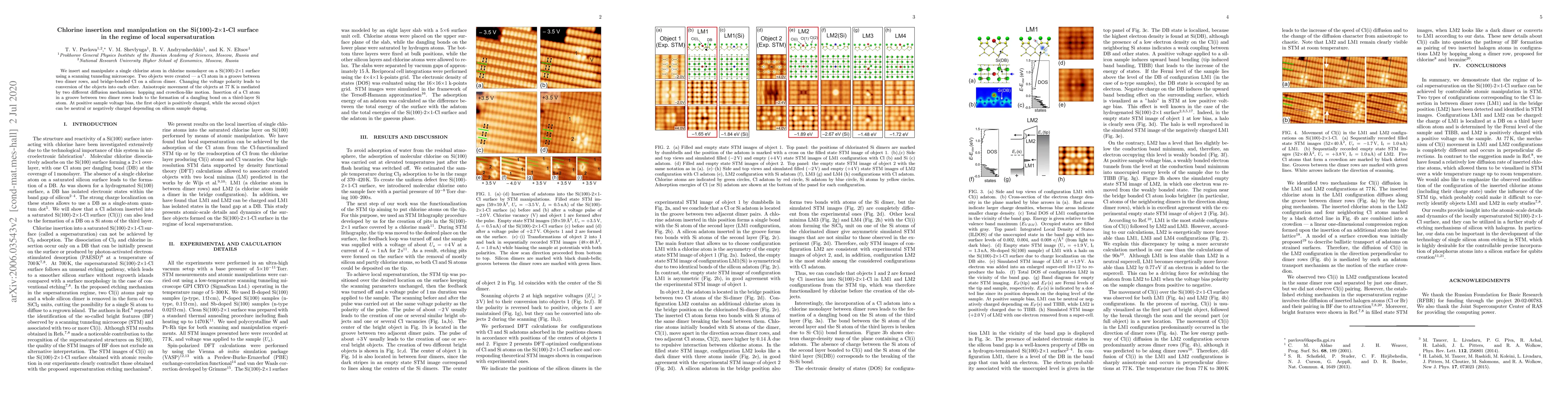 This paper reports on the precise insertion and manipulation of single chlorine atoms on a Si(100)-2x1 surface using a scanning tunneling microscope, revealing two distinct configurations and their interconversion under voltage polarity changes, with different diffusion mechanisms identified at 77 K.
