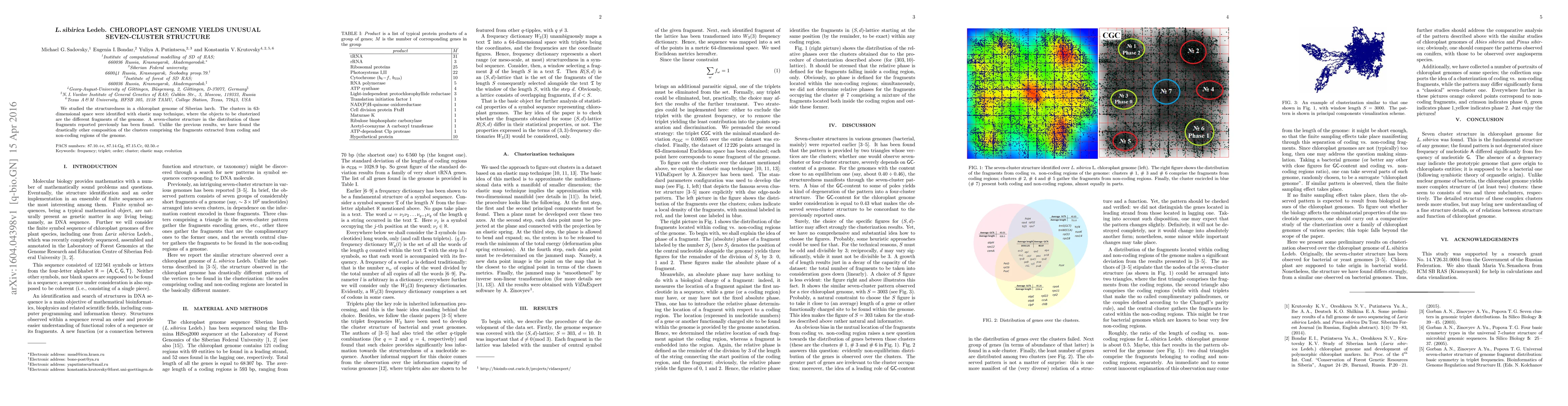 We studied the structuredness in a chloroplast genome of Siberian larch. The clusters in 63-dimensional space were identified with elastic map technique, where the objects to be clusterized are the different fragments of the genome. A seven-cluster structure in the distribution of those fragments reported previously has been found. Unlike the previous results, we have found the drastically other composition of the clusters comprising the fragments extracted from coding and non-coding regions of the genome.