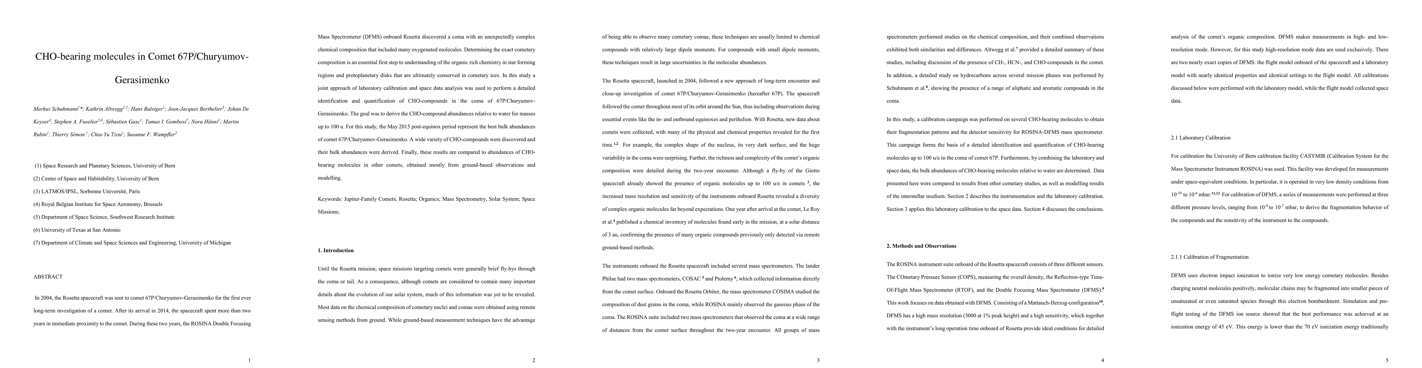 The Rosetta spacecraft's ROSINA DFMS detected a complex chemical composition in the coma of Comet 67P/Churyumov-Gerasimenko, revealing a wide variety of CHO-compounds. The study determined their relative abundances to water, providing insights into the organic chemistry of comets and comparing these findings with other comets' data.