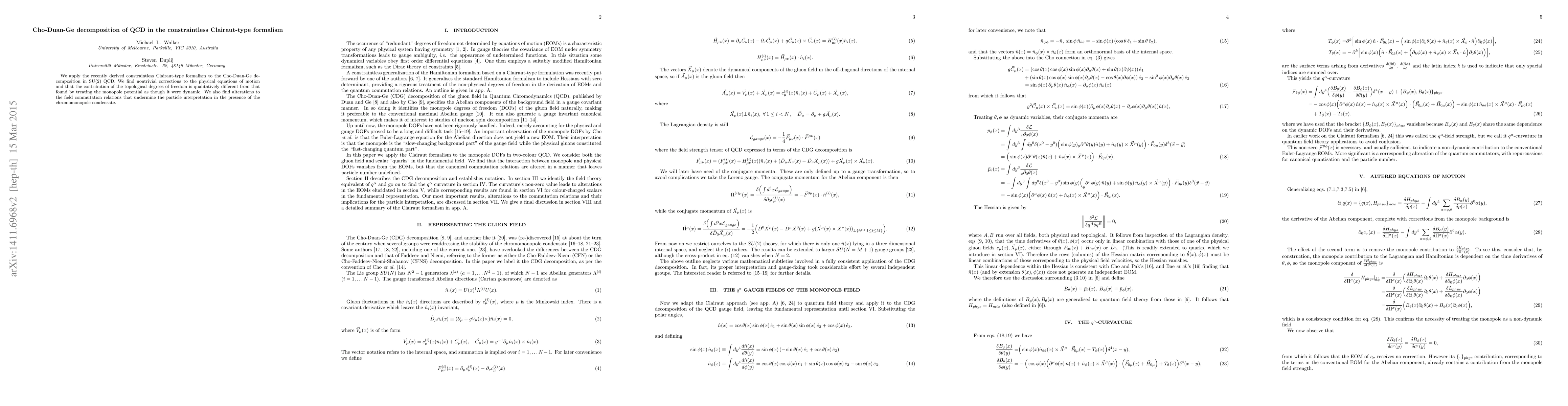 We apply the recently derived constraintless Clairaut-type formalism to the Cho-Duan-Ge decomposition in SU(2) QCD. We find nontrivial corrections to the physical equations of motion and that the contribution of the topological degrees of freedom is qualitatively different from that found by treating the monopole potential as though it were dynamic. We also find alterations to the field commutation relations that undermine the particle interpretation in the presence of the chromomonopole condensate.