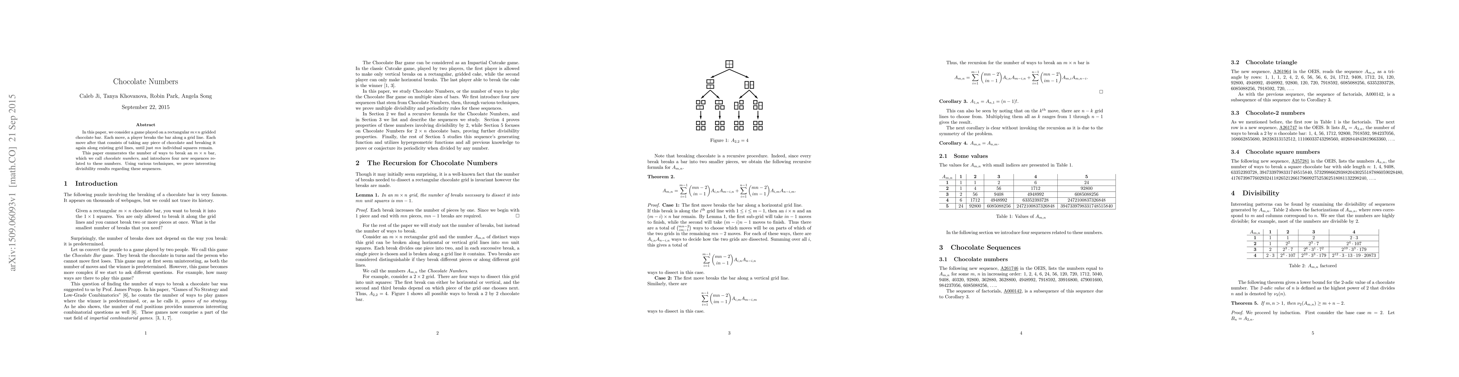 This paper enumerates the number of ways to break an $m \times n$ chocolate bar into individual squares, termed chocolate numbers, and explores four related sequences. It proves interesting divisibility results using various mathematical techniques.