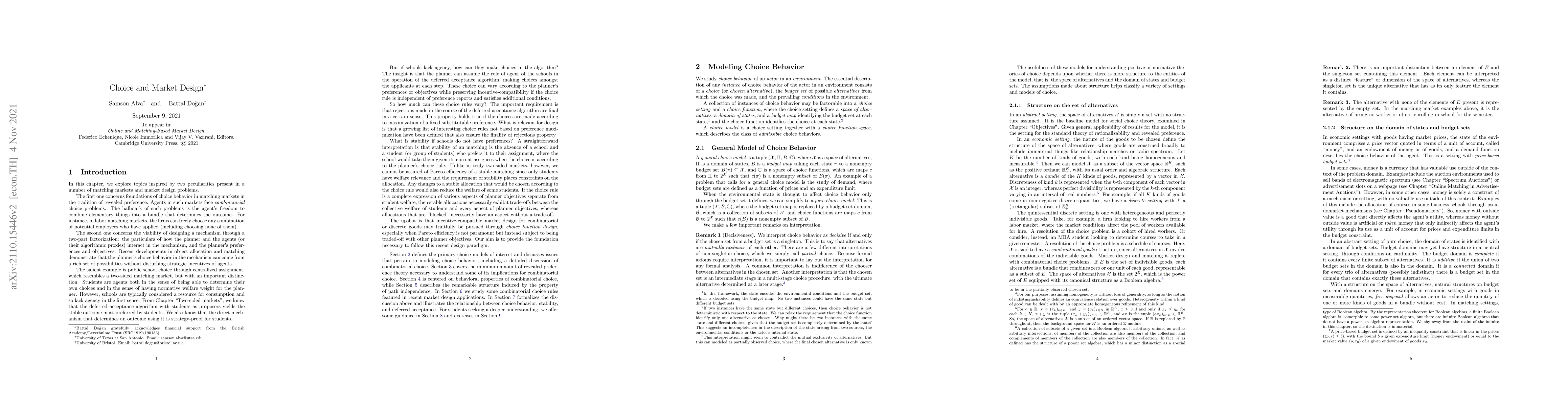 A textbook chapter on modeling choice behavior and designing institutional choice functions for matching and market design. The chapter is to appear in: Online and Matching-Based Market Design. Federico Echenique, Nicole Immorlica and Vijay V. Vazirani, Editors. Cambridge University Press. 2021
