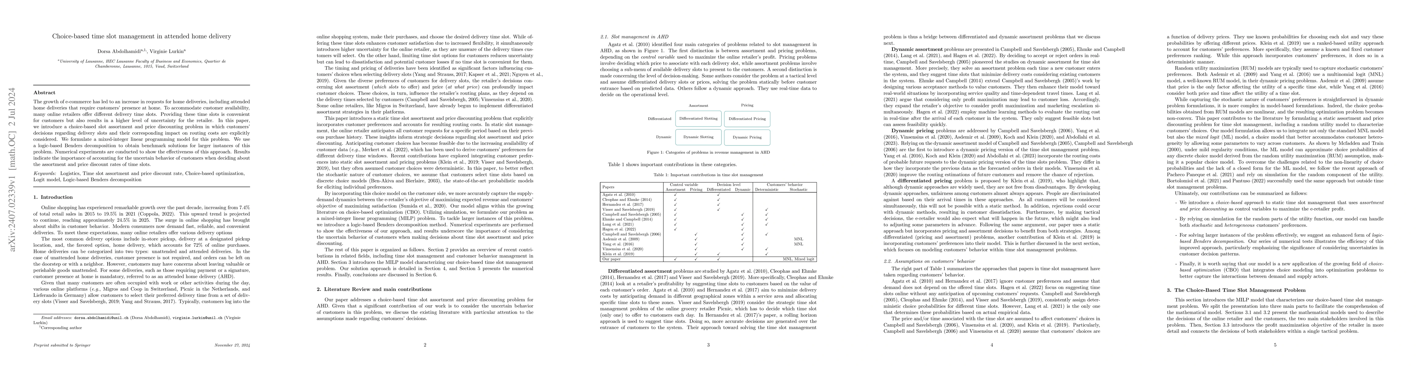 This paper investigates optimizing choice-based time slots for attended home deliveries, proposing a mixed-integer linear programming model and using logic-based Benders decomposition for larger instances. Numerical results emphasize the significance of customer behavior in determining slot assortment and price discounting.