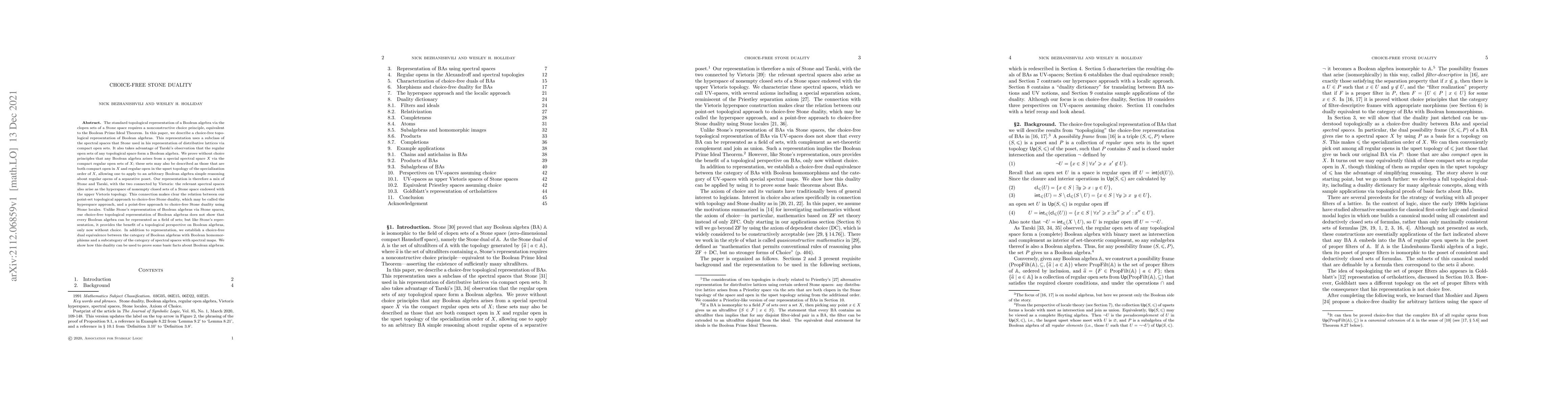 This paper presents a choice-free topological representation of Boolean algebras using special spectral spaces, avoiding nonconstructive choice principles. It establishes a dual equivalence between Boolean algebras and a subcategory of spectral spaces, facilitating basic proofs about Boolean algebras without relying on choice.