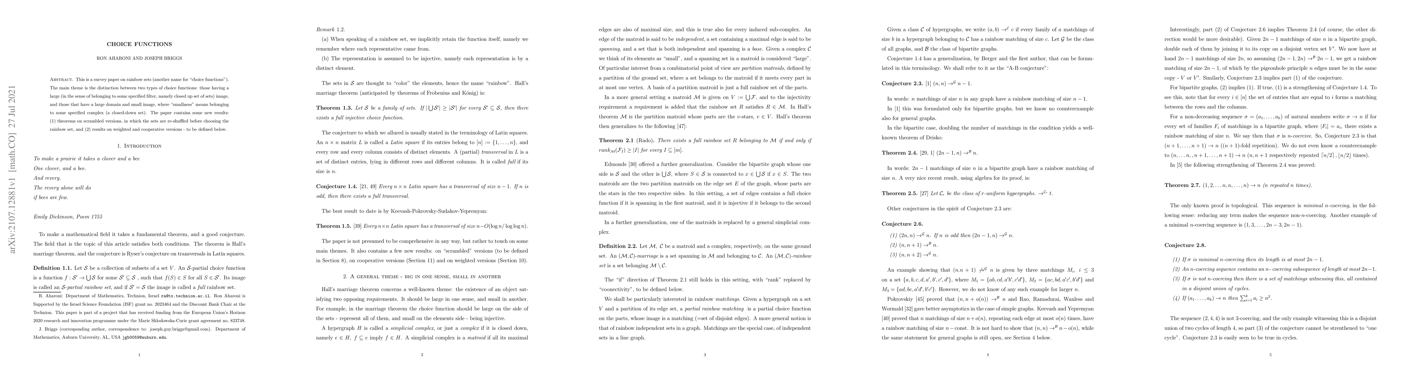 This paper surveys choice functions, a concept in mathematics involving sets of selections, exploring two types: large image sets and small domain sets with large images, leading to new theorems on scrambled and weighted versions.