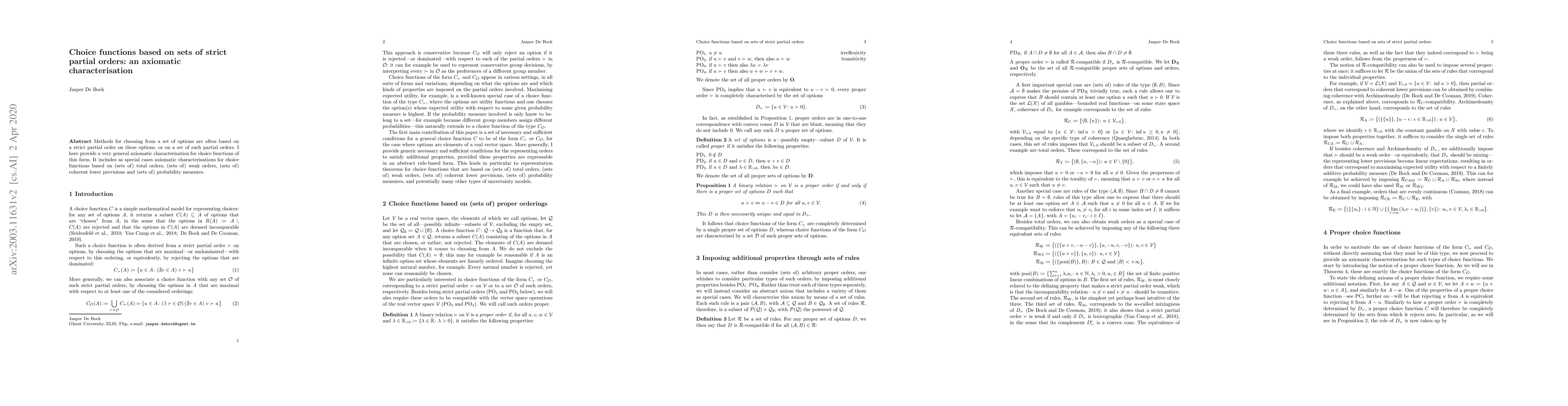 This paper presents a comprehensive axiomatic characterisation for choice functions derived from sets of strict partial orders, encompassing various special cases including total orders, weak orders, coherent lower previsions, and probability measures. The work provides a unified framework for understanding decision-making processes based on different types of order structures.
