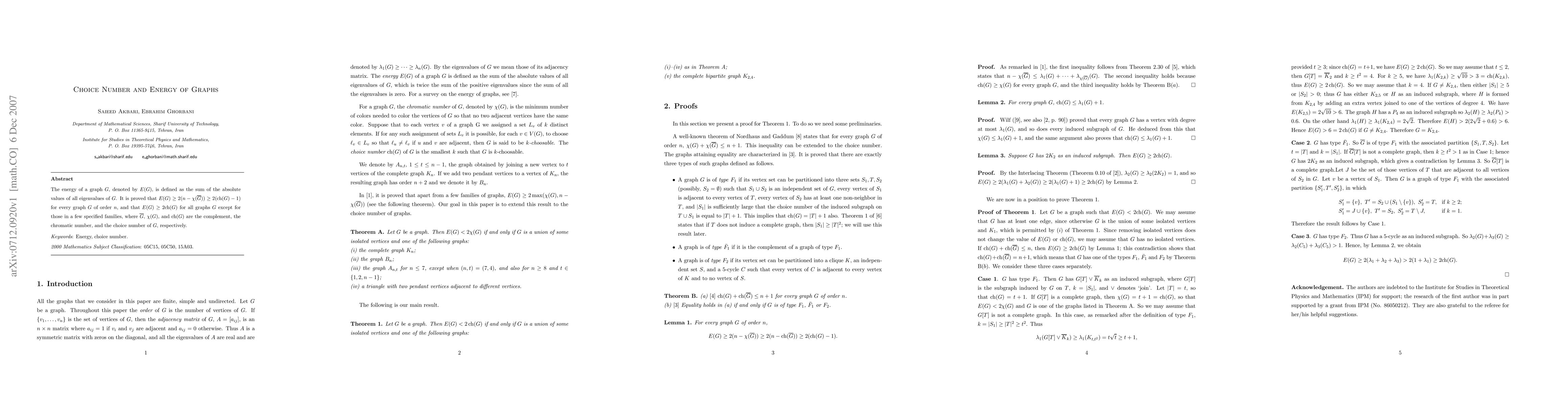 This research establishes lower bounds for the energy of a graph, E(G), in relation to its chromatic number and choice number. It proves E(G) >= 2(n-χ(G)) >= 2(ch(G)-1) for any graph G of order n, and E(G) >= 2ch(G) for most graphs, with exceptions in specific graph families. The study connects graph theory concepts like energy, complement, chromatic number, and choice number.