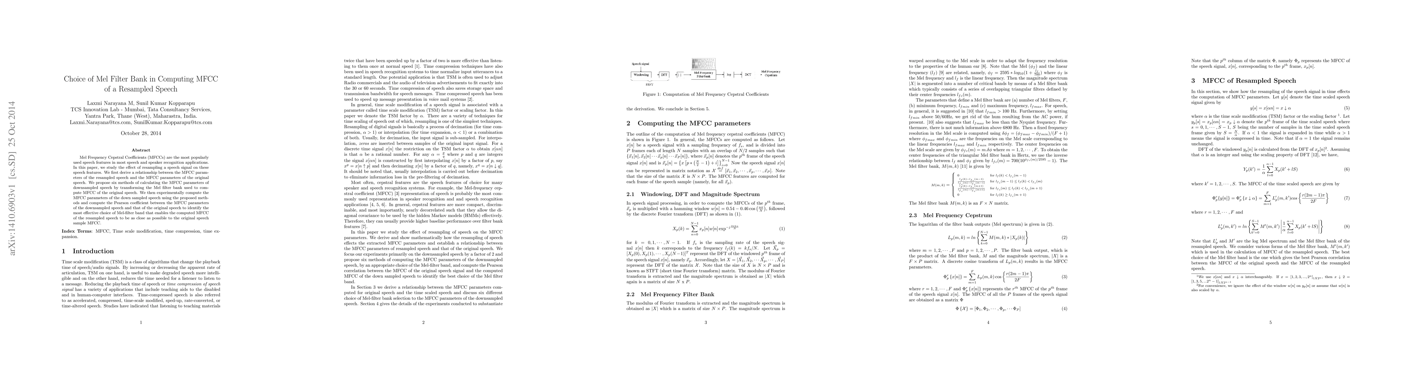 Mel Frequency Cepstral Coefficients (MFCCs) are the most popularly used speech features in most speech and speaker recognition applications. In this paper, we study the effect of resampling a speech signal on these speech features. We first derive a relationship between the MFCC param- eters of the resampled speech and the MFCC parameters of the original speech. We propose six methods of calculating the MFCC parameters of downsampled speech by transforming the Mel filter bank used to com- pute MFCC of the original speech. We then experimentally compute the MFCC parameters of the down sampled speech using the proposed meth- ods and compute the Pearson coefficient between the MFCC parameters of the downsampled speech and that of the original speech to identify the most effective choice of Mel-filter band that enables the computed MFCC of the resampled speech to be as close as possible to the original speech sample MFCC.