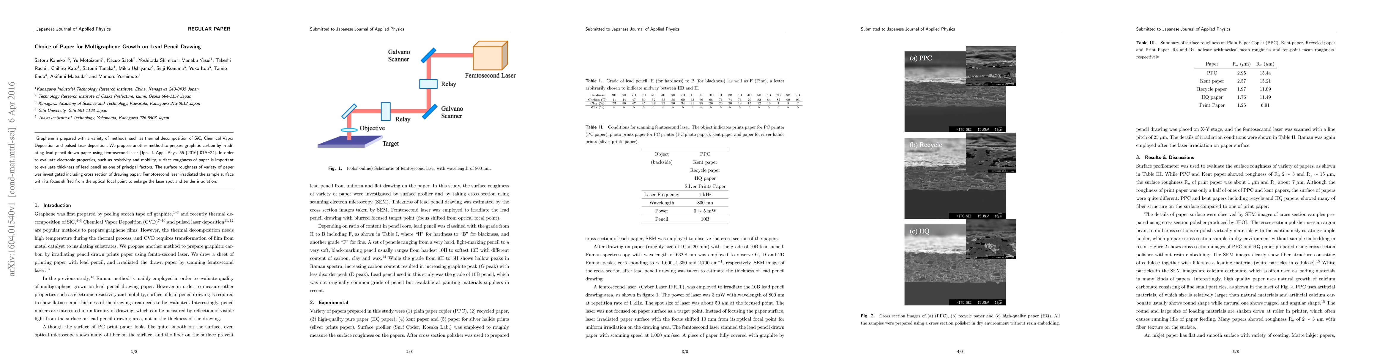This paper proposes a novel method for creating graphitic carbon by irradiating lead pencil drawn paper with a femtosecond laser, emphasizing the importance of paper surface roughness for evaluating electronic properties. The study investigates various papers' cross-sections and uses laser focus shifts to optimize the irradiation process.