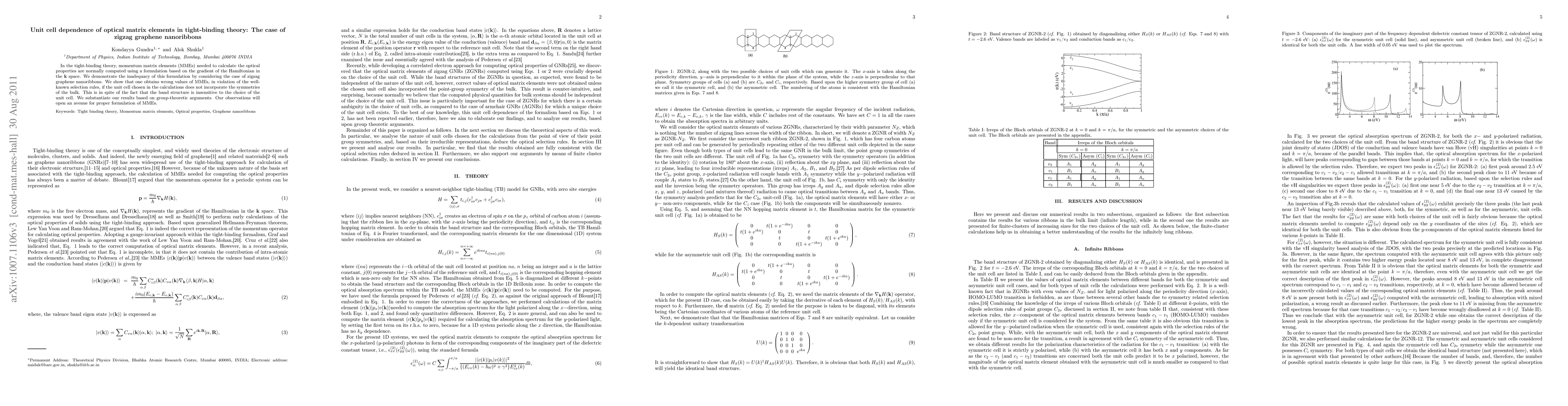 This study emphasizes the necessity of selecting an appropriate unit cell in tight-binding theory for accurately computing optical matrix elements in zigzag graphene nanoribbons. While the band structure remains unaffected by the unit cell choice, incorrect unit cells can lead to erroneous optical matrix elements, violating selection rules.