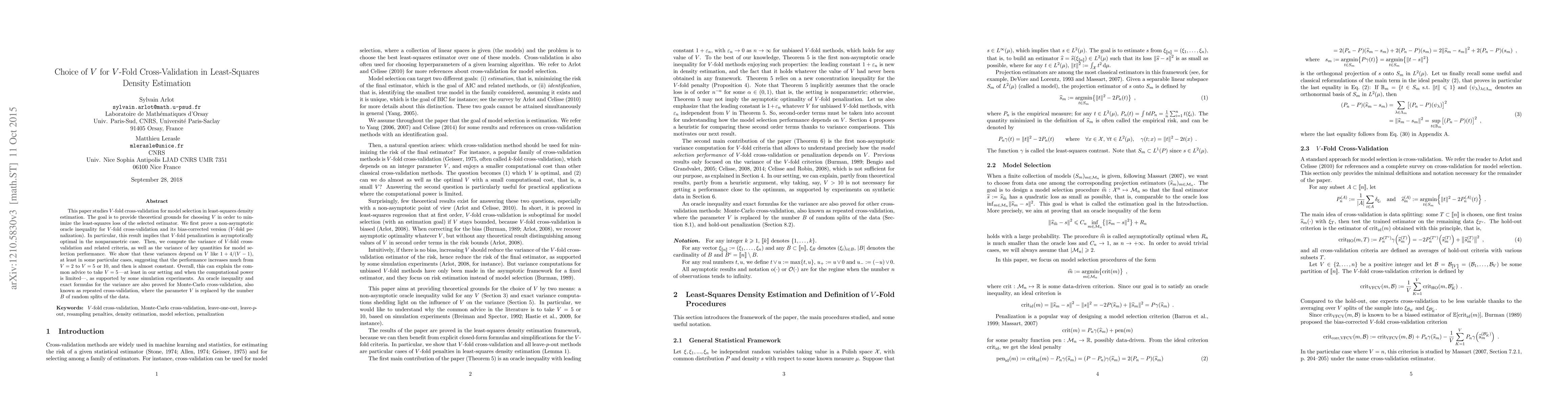This paper investigates the choice of V in V-fold cross-validation for least-squares density estimation, proving an oracle inequality and showing that V-fold penalization is asymptotically optimal. It finds that performance gains are significant when increasing V from 2 to 5 or 10, after which gains are minimal, supporting the common practice of choosing V=5 when computational resources are limited.