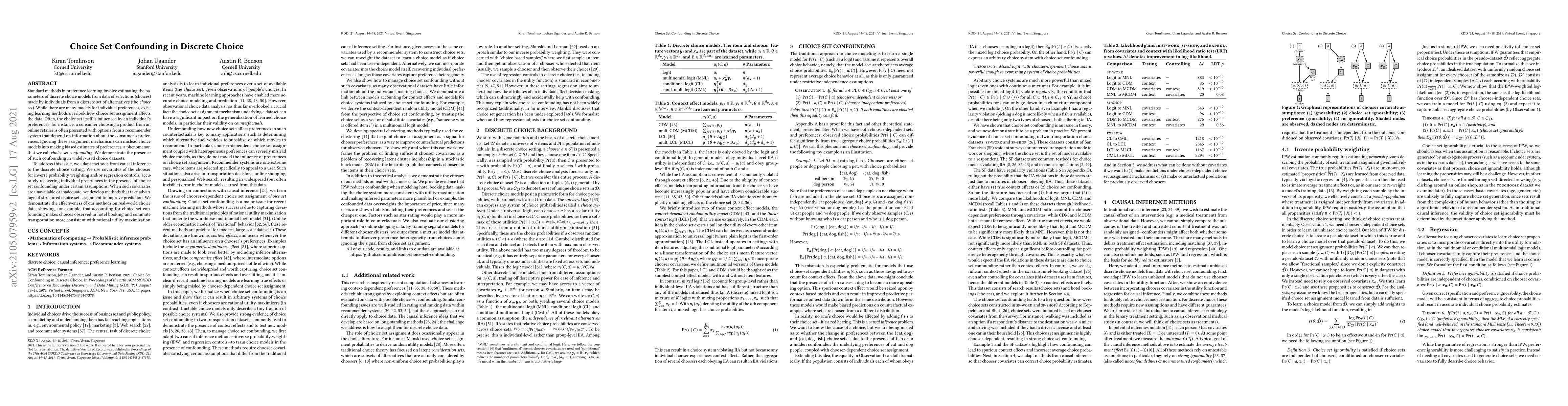 This paper addresses the issue of choice set confounding in discrete choice models, where the assignment of choices influences observed preferences. It proposes methods from causal inference to mitigate this bias, demonstrating improved accuracy in preference estimation and rational choice consistency in real-world datasets.