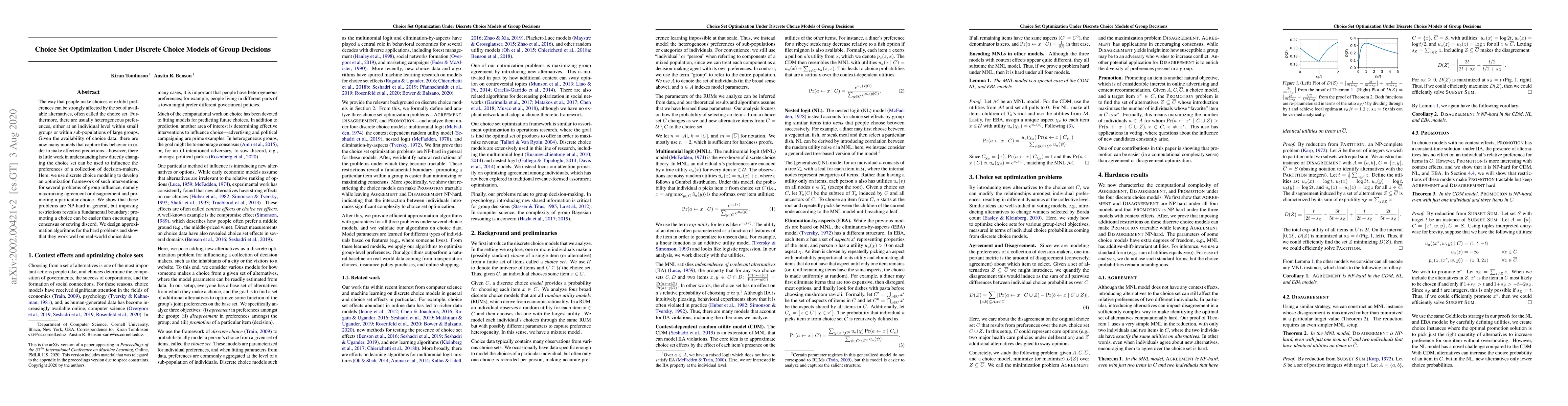 This paper develops an optimization framework for influencing group decisions through choice set manipulation, demonstrating that promoting specific choices can be easier than fostering consensus or discord. It presents approximation algorithms for NP-hard problems and validates their effectiveness using real-world choice data.