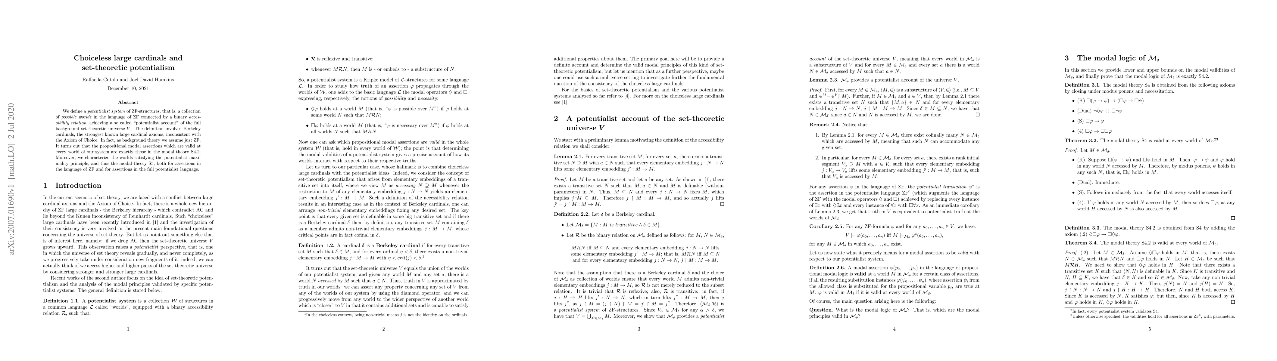 The paper defines a potentialist system of ZF-structures to provide a potentialist account of the full background set-theoretic universe V, using Berkeley cardinals as the strongest known large cardinal axioms inconsistent with the Axiom of Choice.