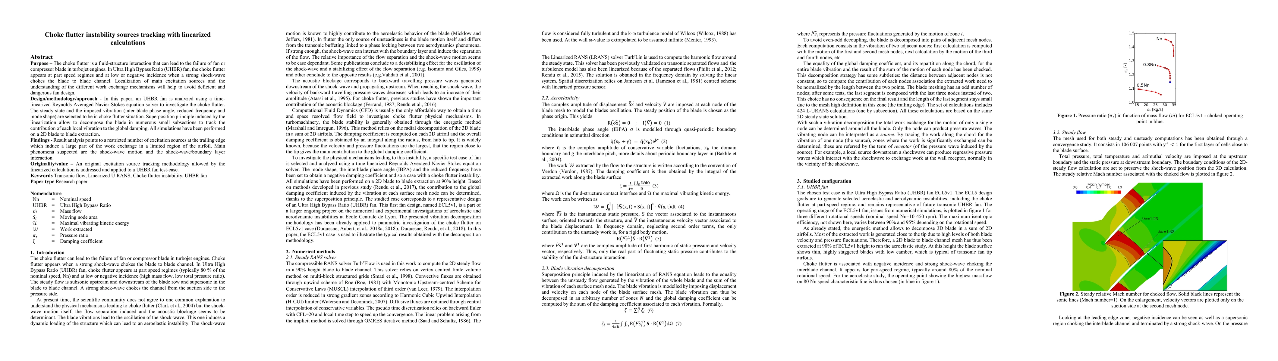 Purpose :The choke flutter is a fluid-structure interaction that can lead to the failure of fan or compressor blade in turbojet engines. In Ultra High Bypass Ratio (UHBR) fan, the choke flutter appears at part speed regimes and at low or negative incidence when a strong shock-wave chokes the blade to blade channel. Localization of main excitation sources and the understanding of the different work exchange mechanisms will help to avoid deficient and dangerous fan design. Design/methodology/approach :In this paper, an UHBR fan is analyzed using a time-linearized Reynolds-Averaged Navier-Stokes equation solver to investigate the choke flutter. The steady state and the imposed vibration (inter blade phase angle, reduced frequency and mode shape) are selected to be in choke flutter situation. Superposition principle induced by the linearization allow to decompose the blade in numerous small subsections to track the contribution of each local vibration to the global damping. All simulations have been performed on a 2D blade to blade extraction. Findings :Result analysis points to a restricted number of excitation sources at the trailing edge which induce a large part of the work exchange in a limited region of the airfoil. Main phenomena suspected are the shock-wave motion and the shock-wave/boundary layer interaction. Originality/value :An original excitation source tracking methodology allowed by the linearized calculation is addressed and applied to a UHBR fan test-case.