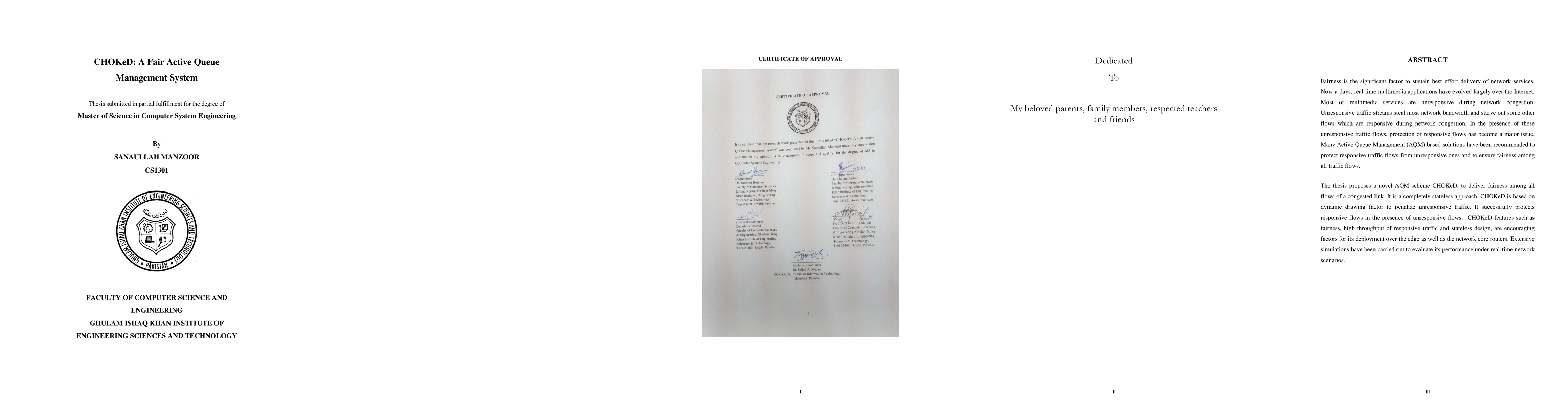 A new Active Queue Management system called CHOKeD is proposed to ensure fairness among network traffic flows during congestion, protecting responsive flows from unresponsive ones. It achieves high throughput and stateless design, making it suitable for deployment on edge and core routers.