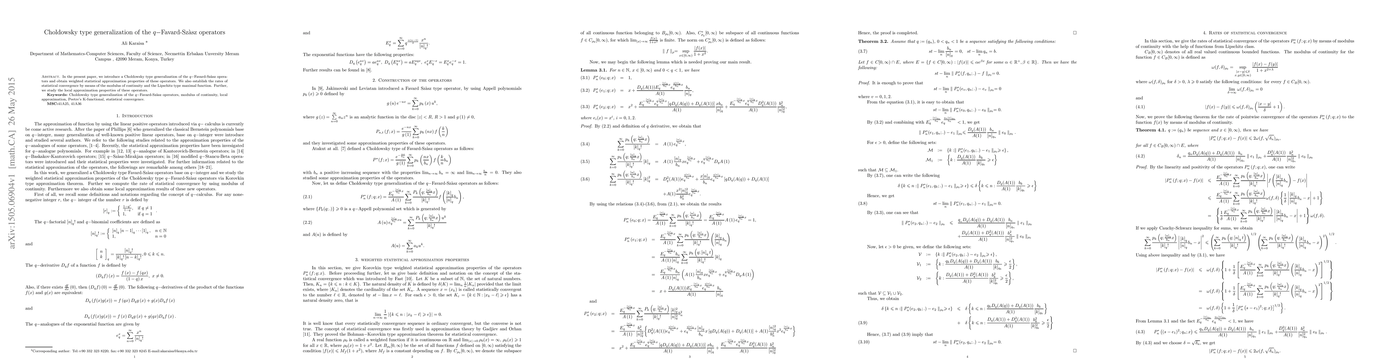 This paper introduces a Choldowsky type generalization of the q-Favard-Szasz operators, examining their weighted statistical approximation properties and establishing rates of statistical convergence via modulus of continuity and Lipschitz type maximal function. Additionally, it explores local approximation properties of these operators.